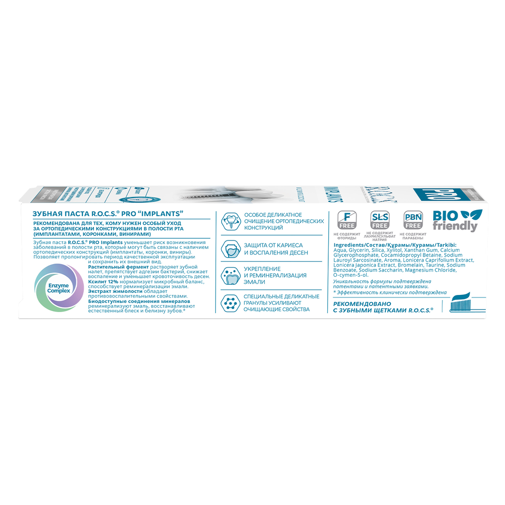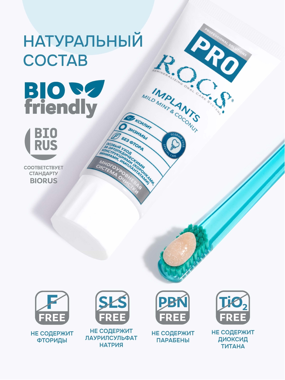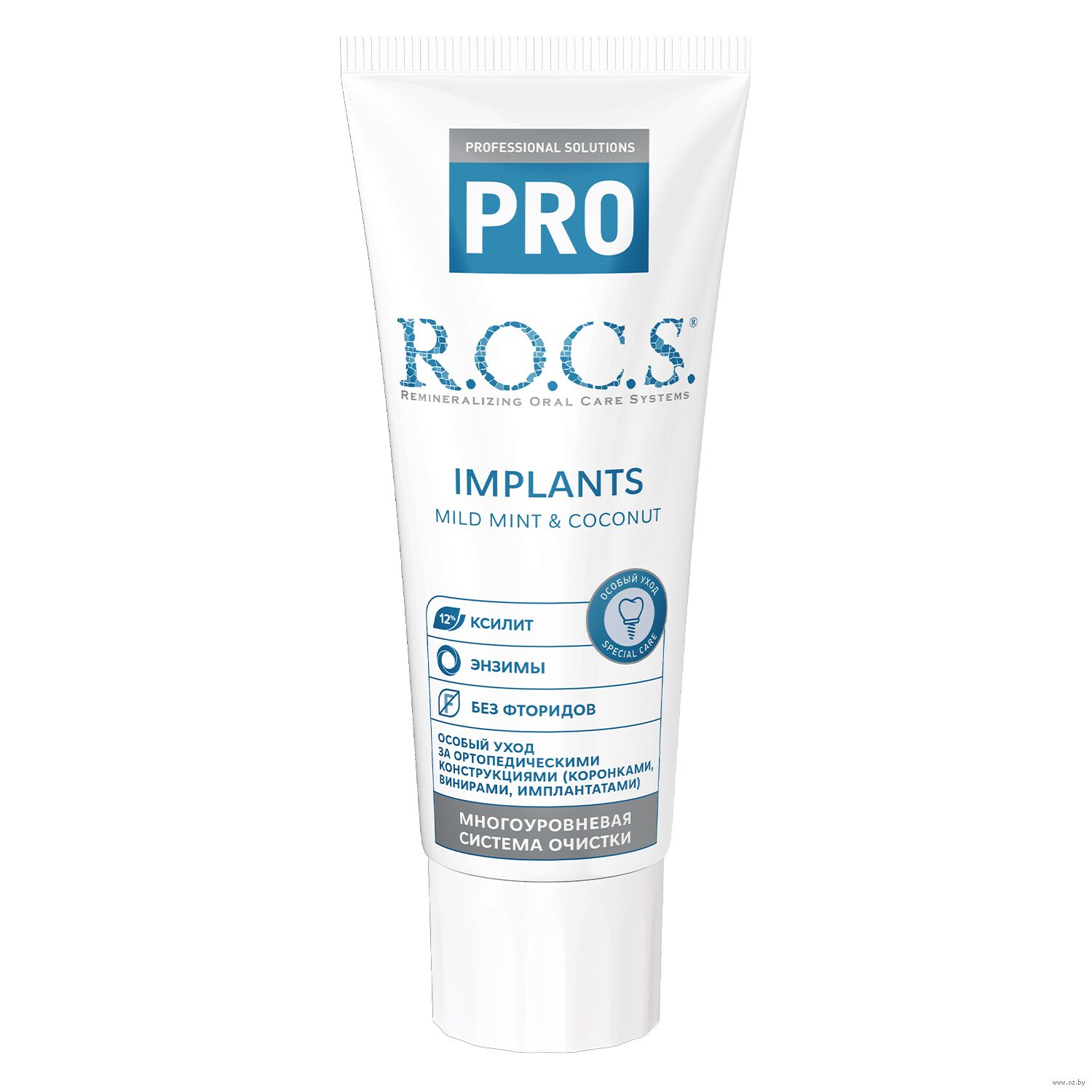 Зубная паста R.O.C.S.® PRO Implants уменьшает риск возникновения заболеваний в полости рта, которые могут быть связаны с наличием ортопедических конструкций (имплантаты, коронки виниры). Позволяет пролонгировать период качественной эксплуатации и сохранить их внешний вид.