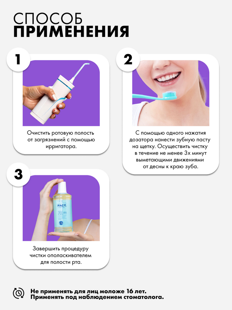 Небольшое количество пасты нанесите на зубную щётку. Чистите зубы в течение 2-х минут, после чего ополосните рот водой. Улыбнитесь! Не забывайте чистить зубы дважды в день и менять зубную щётку каждые 3 месяца.Состав