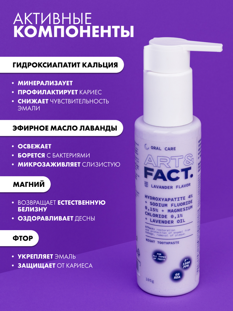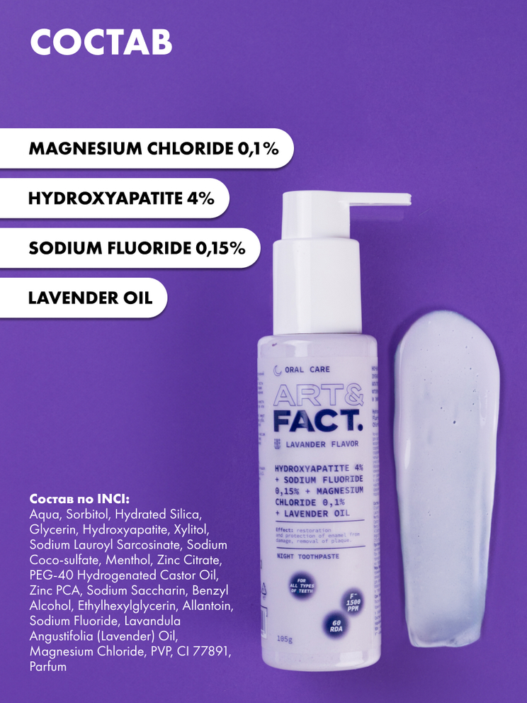 Ночная зубная паста предназначена для восстановления эмали после негативного воздействия кислот в течение дня, которые содержатся в пище и бактериях.