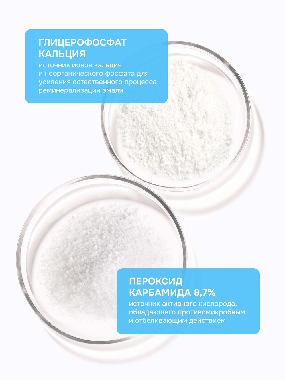 Glycerin, propylene glycol, polyethylene, carbamide peroxide, carbomer, peg-40 hydrogenated castor oil, aroma, tromethamine, calcium glycerophosphate, h2o2 не более 5%.