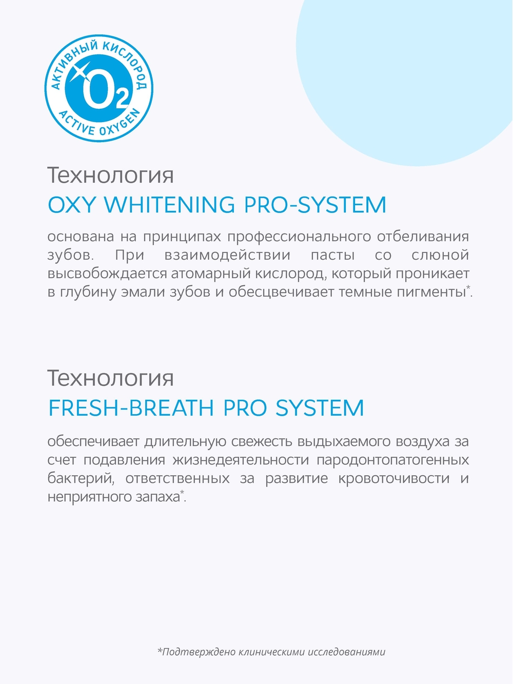 Запатентованная зубная паста содержит активный кислород, обладающий осветляющим и бактерицидным действиями. Эффективно устраняет неприятный запах изо рта. Технология Oxy Whitening Pro-System основана на принципах профессионального отбеливания зубов. При взаимодействии пасты со слюной высвобождается атомарный кислород, который, который проникает в глубину эмали зубов и обесцвечивает темные пигменты*. Технология Fresh-Breath Pro System обеспечивает длительную свежесть выдыхаемого воздуха за счет подавления жизнедеятельности пародонтопатогенных бактерий, ответственных за развитие кровоточивости и неприятного запаха*.