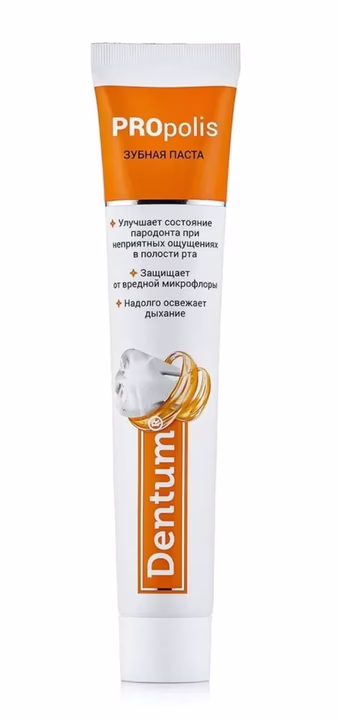 Зубная паста "Dentum" с прополисом и эфирными маслами лекарственных растений.