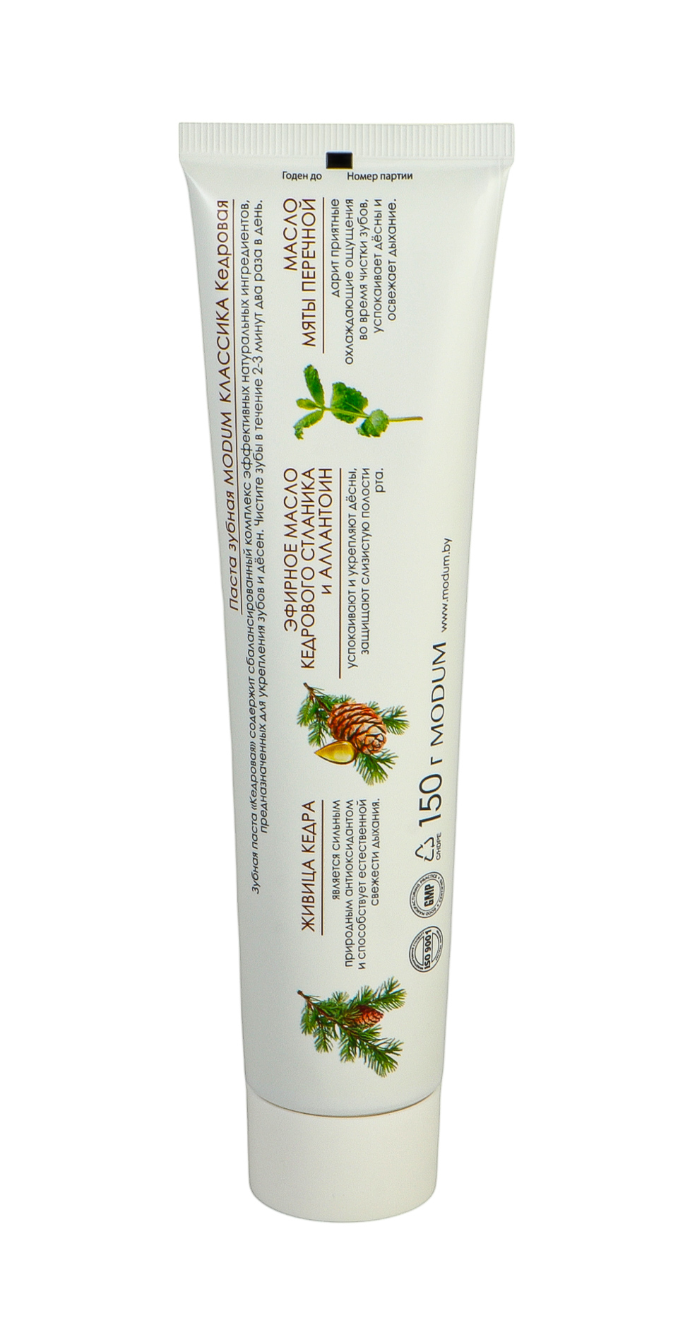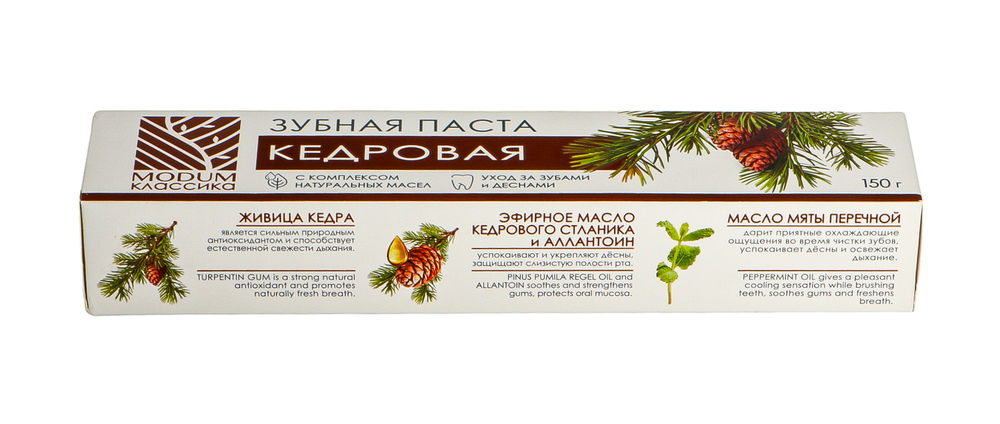 Комплексное защитное и укрепляющее действие: активный кальций обогащает эмаль минералами, растительные компоненты укрепляют дёсны и освежают дыхание. На основе экстракта живицы кедра, масел мяты и кедрового стланика.