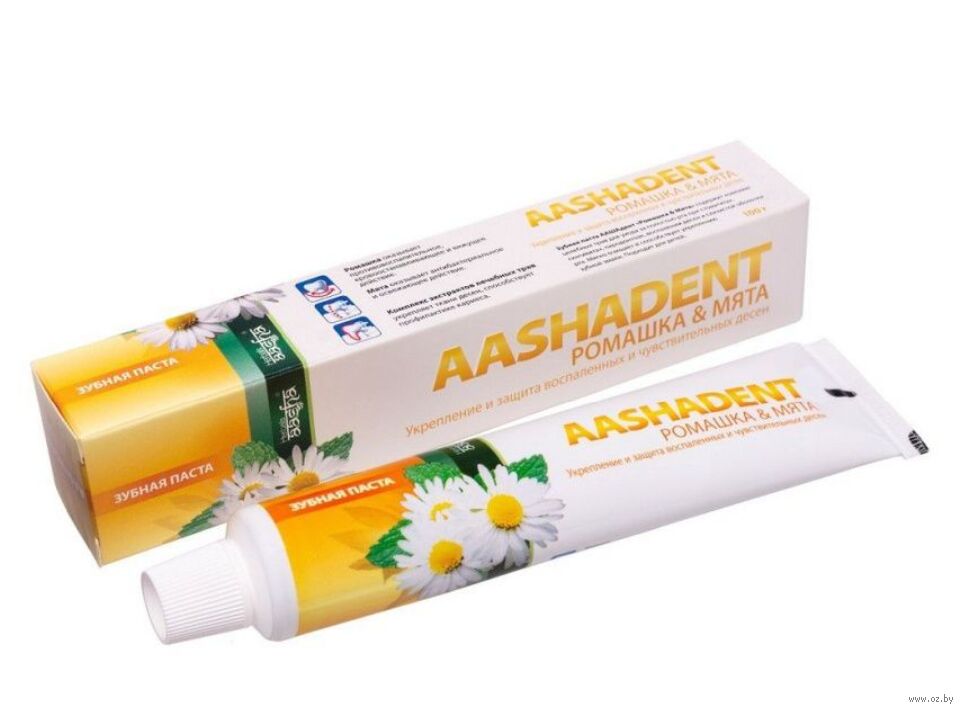 Зубная паста сочетает в себе целебное действие ромашки и свежесть мяты, придает свежесть дыханию. Обладает мягким цветочным вкусом. Зубная паста с таким составом универсальна и рекомендована без ограничений к применению. И следует подчеркнуть, что восстановление воспаленных и чувствительных десен, также одно из достоинств пасты. Основное действие ромашки – противовоспалительное.