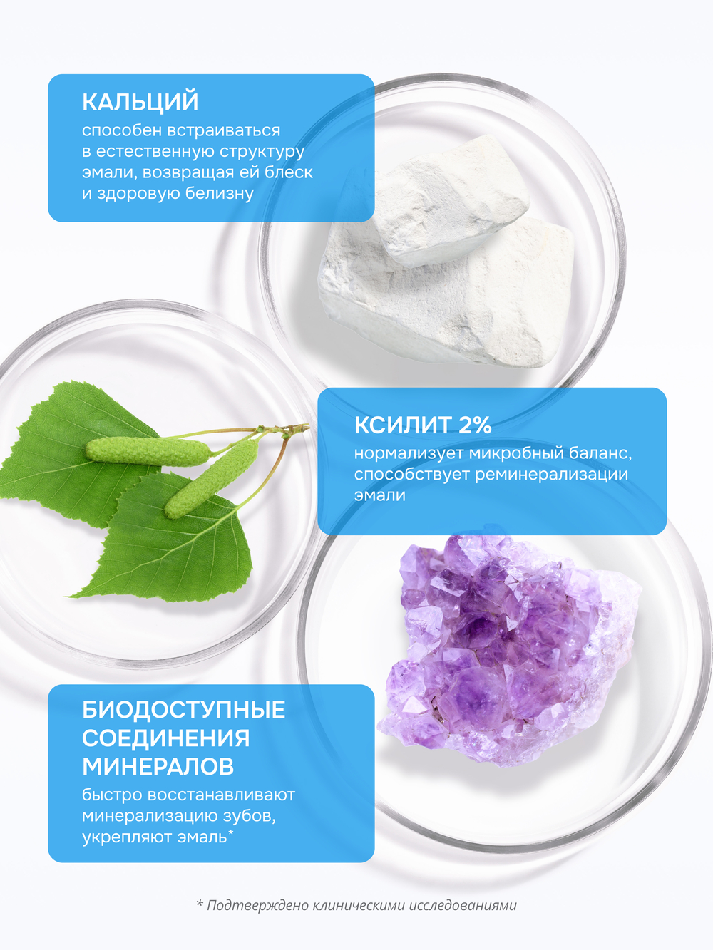 2% ксилит. Ксилит защищает от кариеса, препятствует росту кариесогенных бактерий. Освежающий аромат мяты с нотками мандарина. Кальций и фосфор активно укрепляют и восстанавливают прочность эмали.