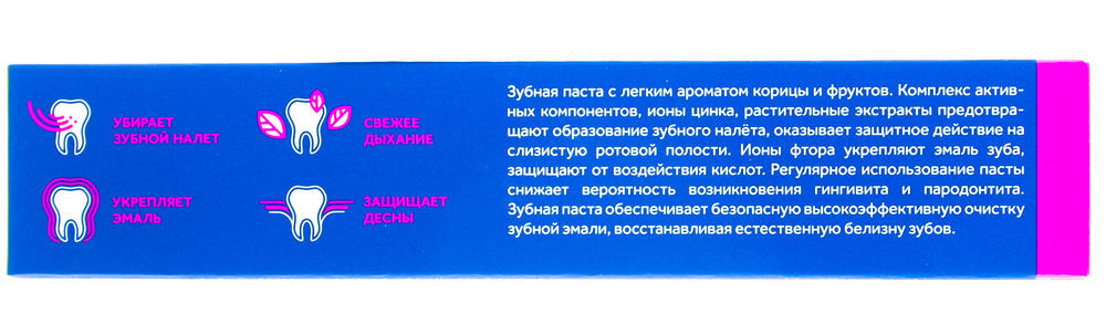 Зубная паста с легким ароматом корицы и фруктов. Комплекс активных компонентов, ионы цинка, растительные экстракты предотвращают образование зубного налёта, оказывает защитное действие на слизистую ротовой полости. Ионы фтора укрепляют эмаль зуба, защищают от воздействия кислот. Регулярное использование пасты снижает вероятность возникновения гингивита и пародонтита. Зубная паста обеспечивает безопасную высокоэффективную очистку зубной эмали, восстанавливая естественную белизну зубов.