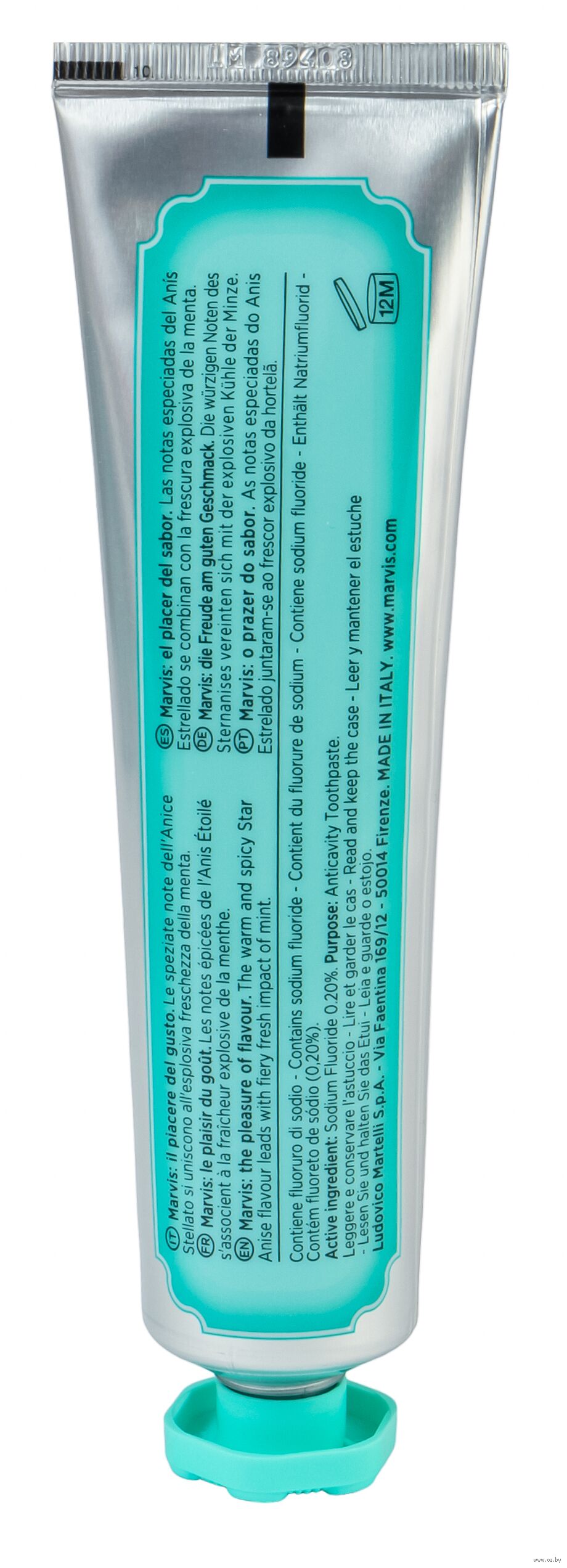Итальянское качество и непревзойденный вкус в одном тюбике зубной пасты. Бренд Marvis способен полностью разрушить Ваше представление об уходе за ротовой полостью. Зубная паста "Анис и мята" это длительное ощущение свежести благодаря острым нотам аниса и ледяной мяты. Формула пасты, богата полезными элементами, деликатно очищает ваши зубы от загрязнений, табака, чая, кофе и вина.