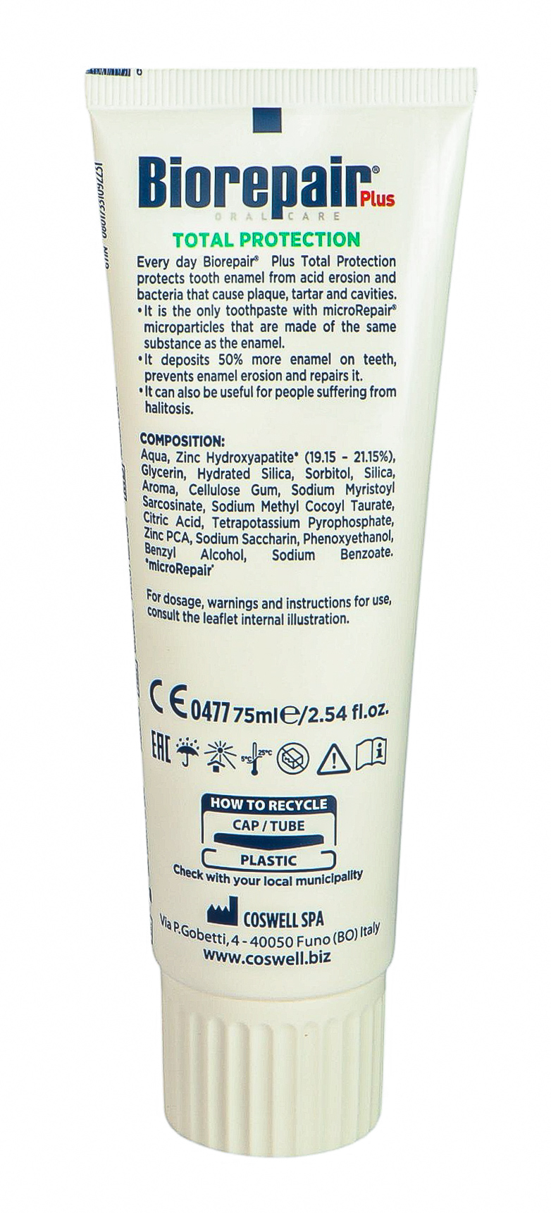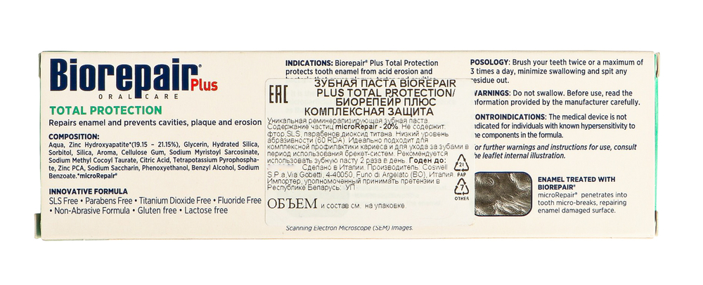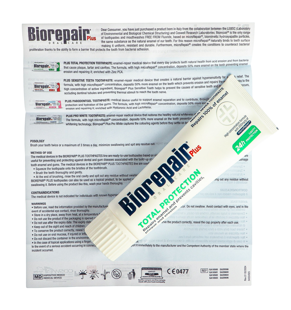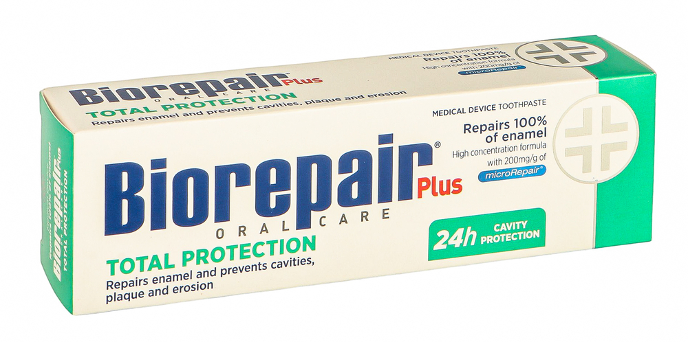 Продукты Biorepair содержат в составе активное вещество MicroRepair – микрокристаллы медицинского гидроксиапатита (цинк-замещенный-карбонат-гидроксиапатит). Он аналогичен естественному гидроксиапатиту, который входит в состав костей и зубов и составляет 96% зубной эмали.