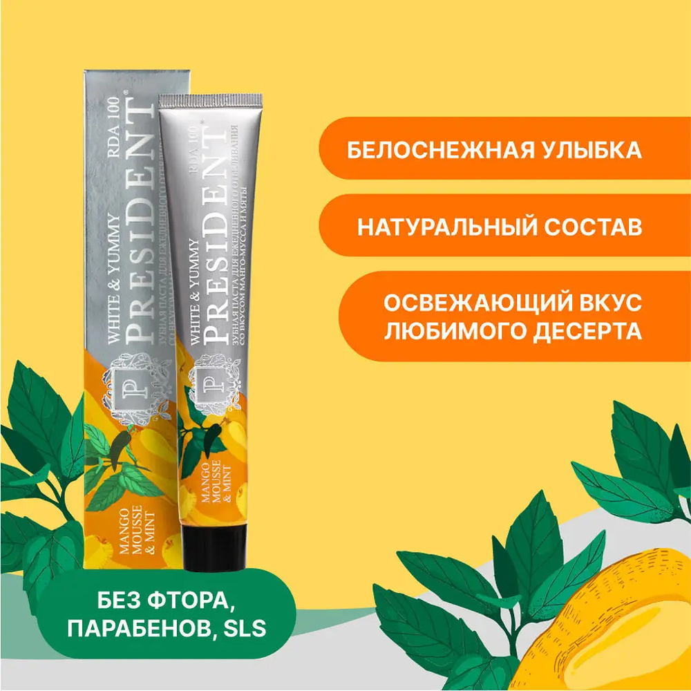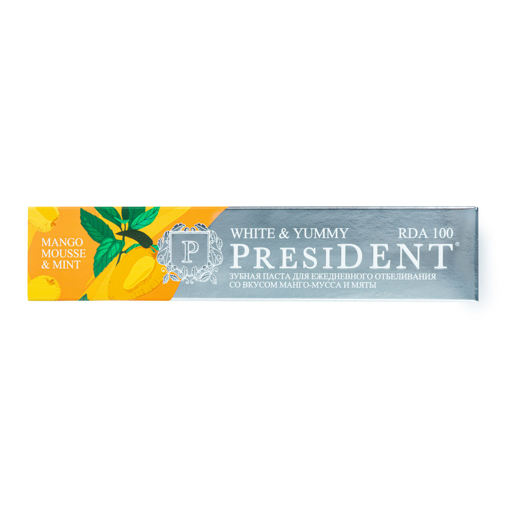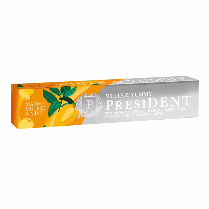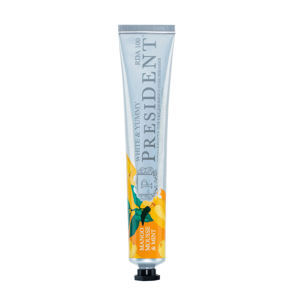 Отбеливающая зубная паста Манго-мусс с мятой White & Yummy RDA 100 представлена под маркой PresiDENT и предназначена для ежедневного ухода. Средство с абразивными частицами, натуральным ухаживающим комплексом и безопасным подсластителем обладает вкусом и ароматом фруктового десерта с мятой.
