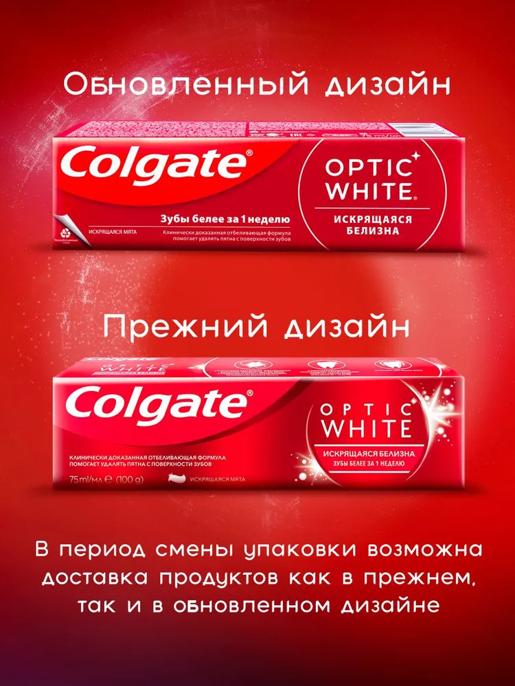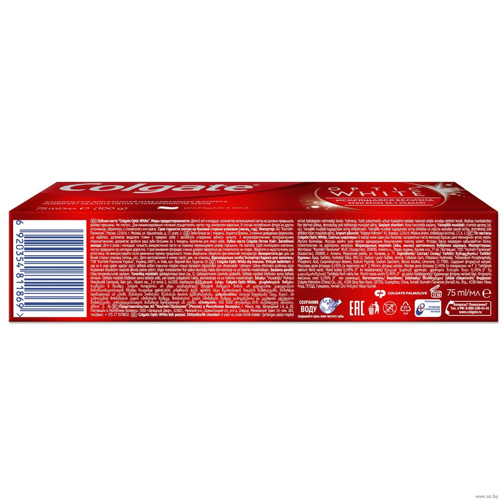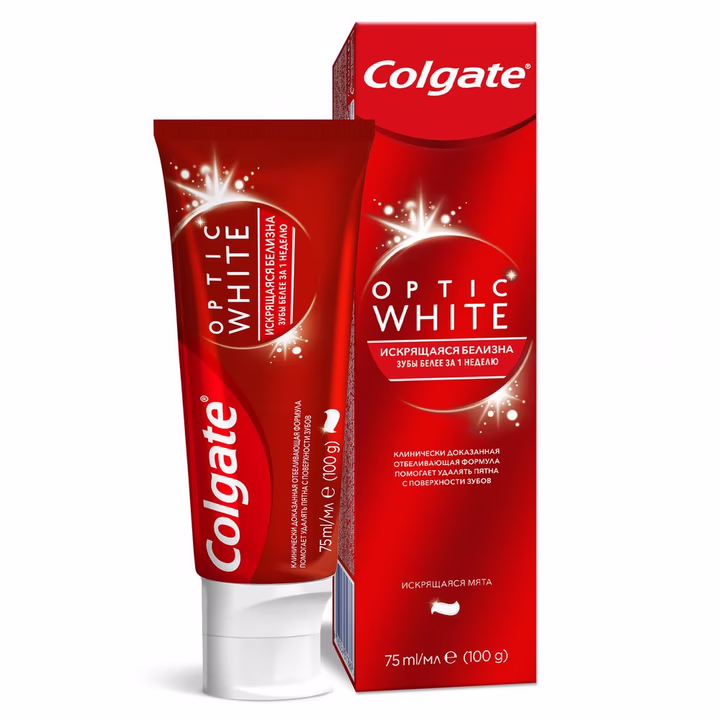 Зубная паста Colgate "Optic White" с высокоэффективными полирующими микрочастицами содержит ингредиент, подобный тому, что используют стоматологи. Зубная паста бережно удаляет потемнения с поверхности зубов, а также препятствует образованию зубного камня, помогая сделать ваши зубы белее. Подходит для ежедневного использования.