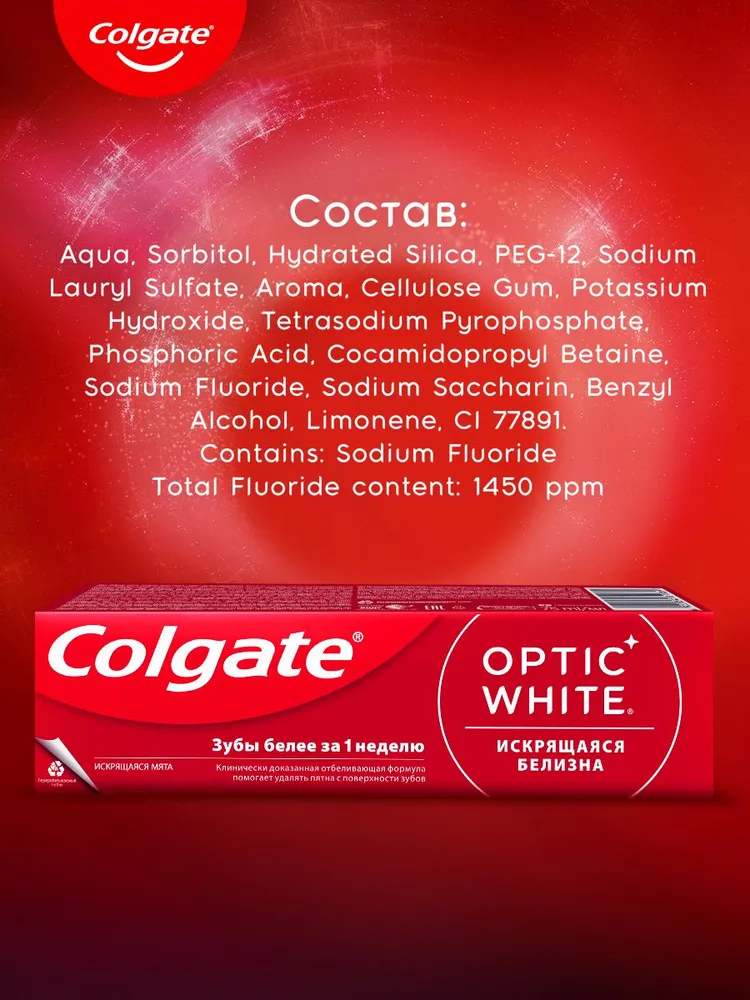 Aqua, Hydrated Silica, Sorbitol, Glycerin, PEG-12, Pentasodium Triphosphate, Tetrapotassium Pyrophosphate, Sodium Lauryl Sulfate, Aroma, Cellulose Gum, Cocamidopropyl Betaine,Sodium Saccharin, Xanthan Gum, Sodium Hydroxide, Sodium Fluoride, Limonene, CI 77891, CI 42090.Мы используем файлы cookie для обеспечения удобства работы с сайтом и его контакта с пользователем.
