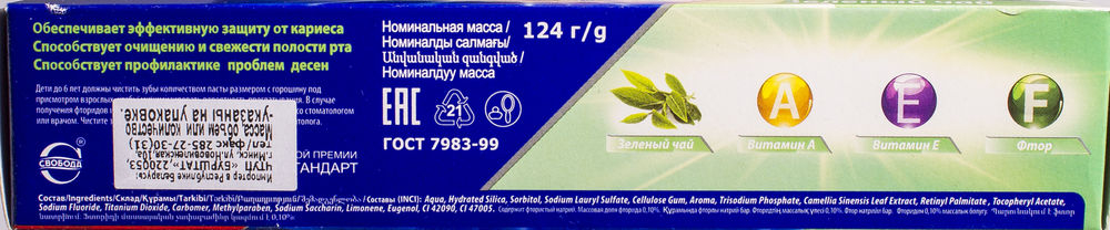 Вода, сорбитол/глицерин, диоксид кремния, натрий-карбоксиметилцеллюлоза, натрия лаурилсульфат, ароматическая композиция, тринатрийфосфат, экстракт зеленого чая, ретинола пальмитат, токоферола ацетат, натрий фтористый (0,22%), диоксид титана, карбомер, метилпарабен, натрия сахарин, пропиленгликоль, лимонен, эвгенол, C.I. 42090, C.I.47005.