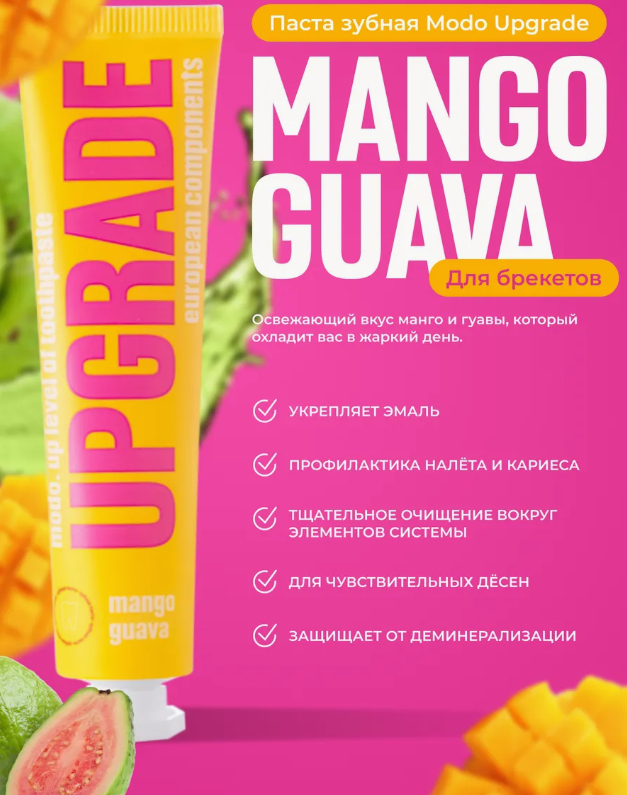 Зубная паста Modo Upgrate Mango Guava создана для эффективной защиты и максимального комфорта во время лечения.