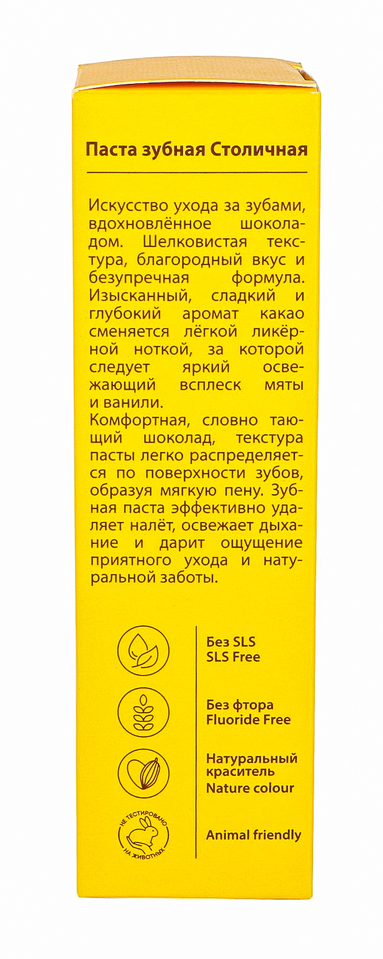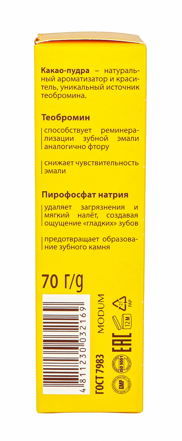 Зубная паста эффективно удаляет налёт, освежает дыхание и дарит ощущение приятного ухода и натуральной заботы. Какао-пудра – натуральный ароматизатор и краситель, уникальный источник теобромина. Теобромин способствует реминерализации зубной эмали аналогично фтору.