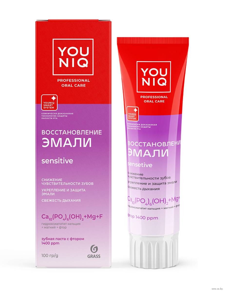 Зубная паста Youniq "Для чувствительных зубов" является специализированным продуктом, разработанным для людей с повышенной чувствительностью зубов. Ее основные активные ингредиенты – это 10% суспензия гидроксиапатита кальция, магний и фтор (1400ppm).
