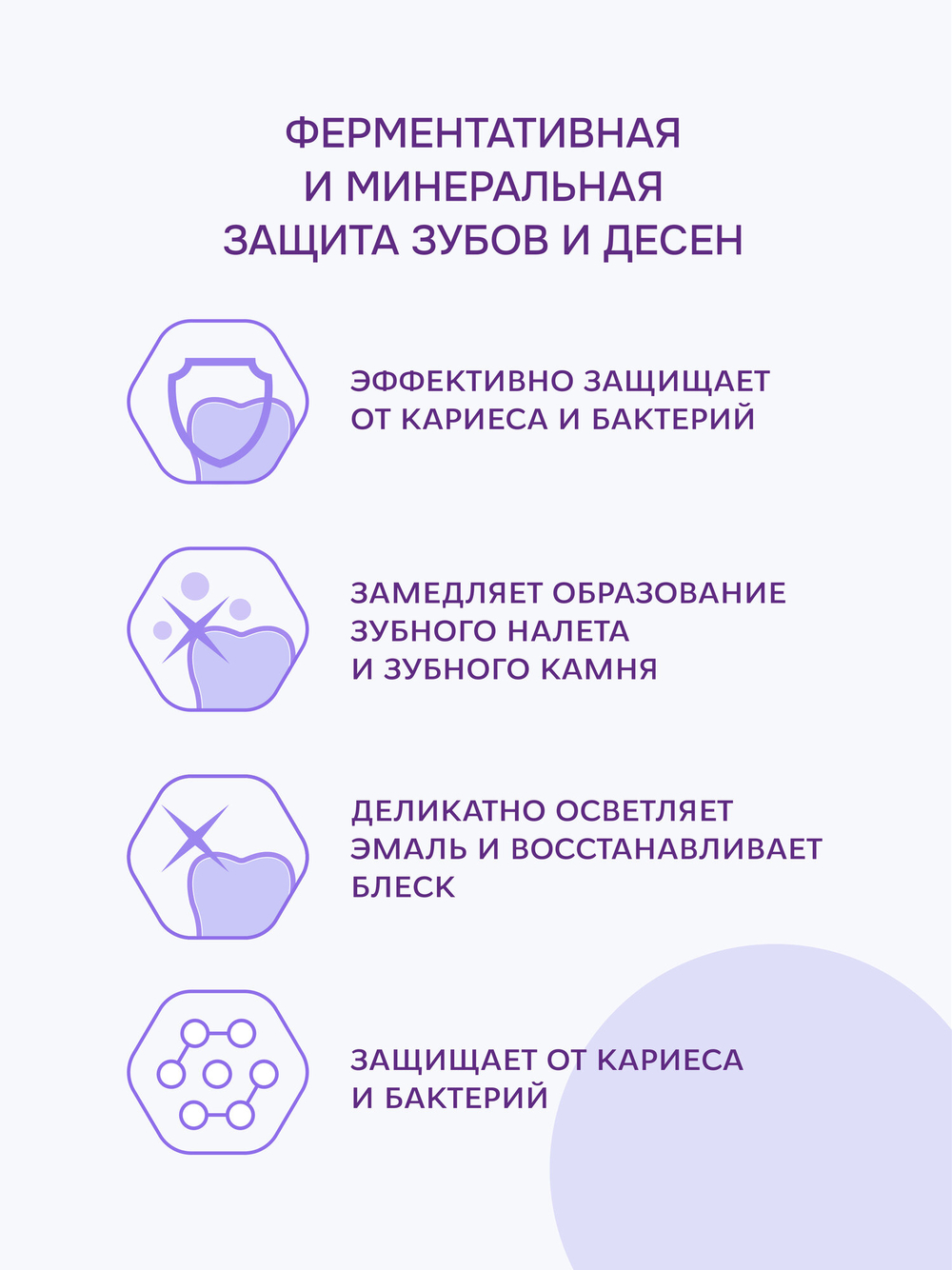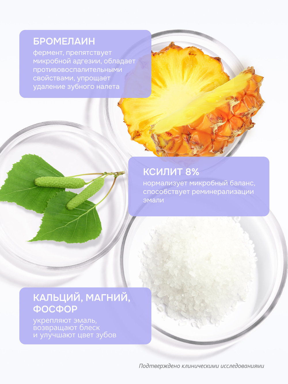 Активные гранулы особой структуры на начальном этапе чистки зубов эффективно удаляют мягкий зубной налет и, постепенно распадаясь на более мелкие частицы, обеспечивают полировку эмали на заключительном этапе чистки. Бромелаин (растительные энзимы) деликатно удаляет зубной налет и уменьшает воспаление**. Кальций, магний, фосфаты укрепляют эмаль, возвращают блеск и улучшают цвет зубов**. Ксилит 8% защищает от бактерий и нормализует состав микрофлоры**.