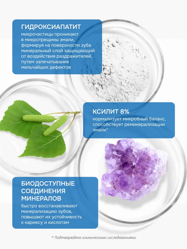 Низкоабразивная формула мягко очищает, не травмирует эмаль и дентин. Активные компоненты пасты обеспечивают сразу три механизма снижения чувствительности: минеральное восстановление структур зуба за счет биодоступных кальция и фосфора; запечатывание дентинных канальцев разноразмерными частицами гидроксиапатита; усиление процессов реминерализации благодаря магнию и ксилиту.