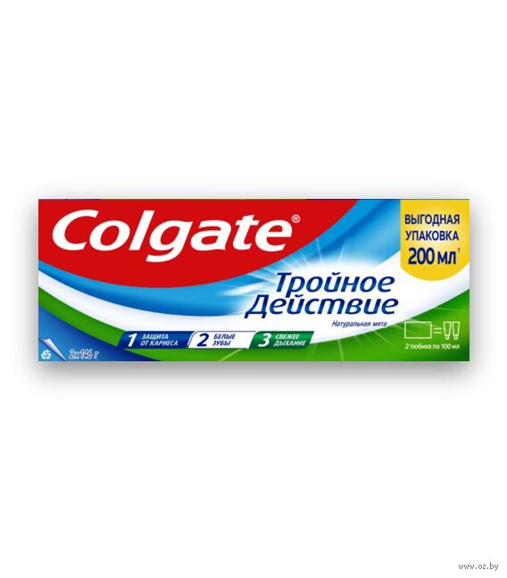 Зубная паста "Тройное действие" обеспечивает максимальную защиту от кариеса. Эта трехцветная зубная паста оказывает тройное действие: помогает защищать зубы от кариеса, помогает удалять потемнения с поверхности зубов и освежает дыхание. Что немаловажно, обладает приятным мятным вкусом!