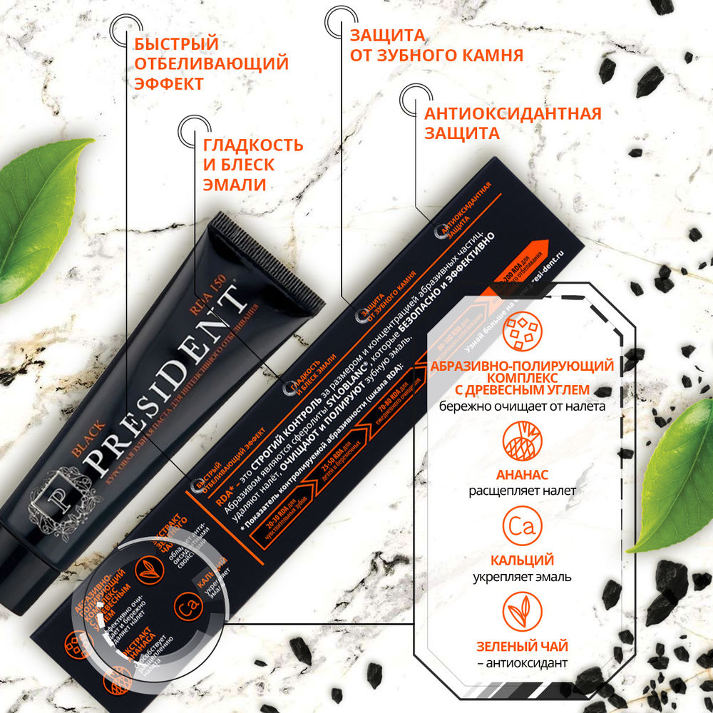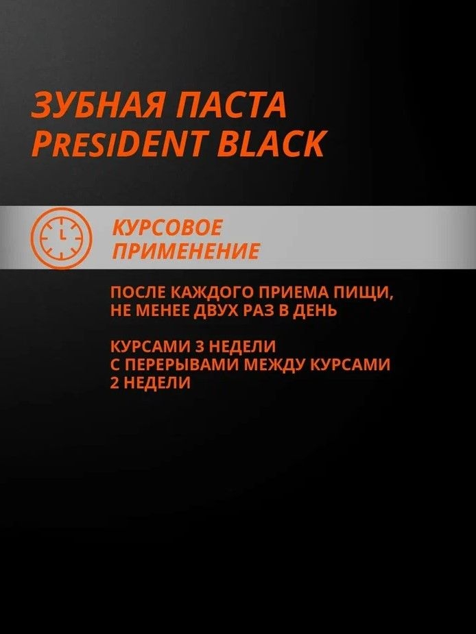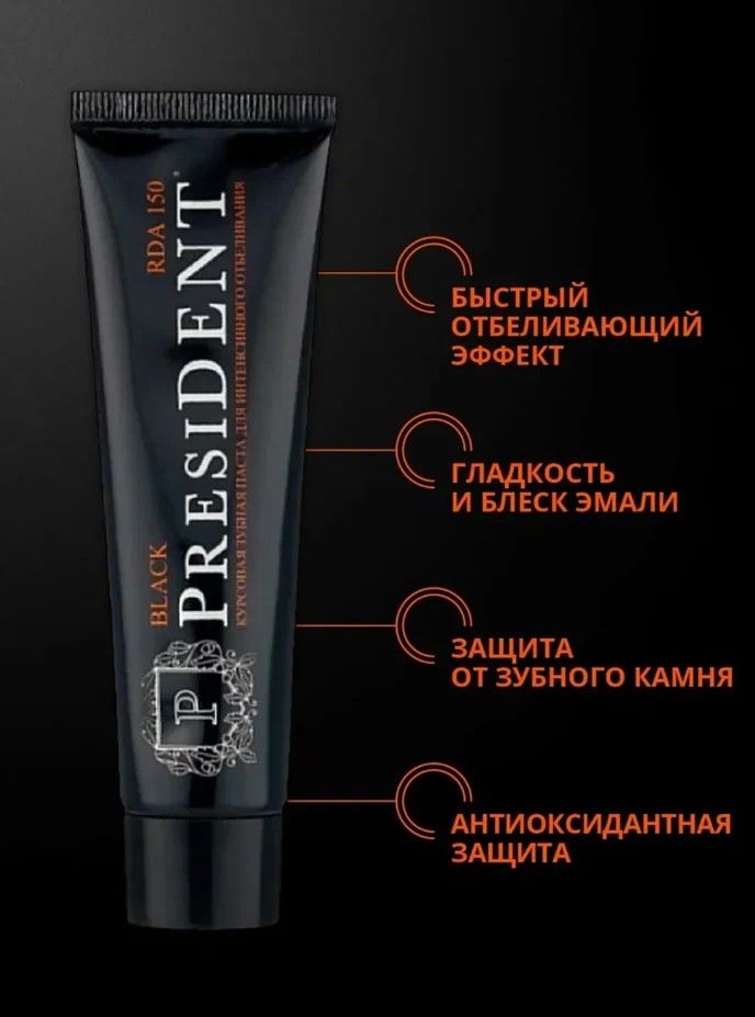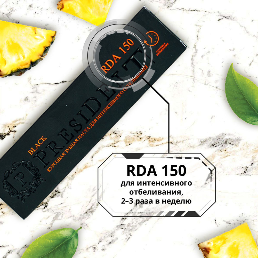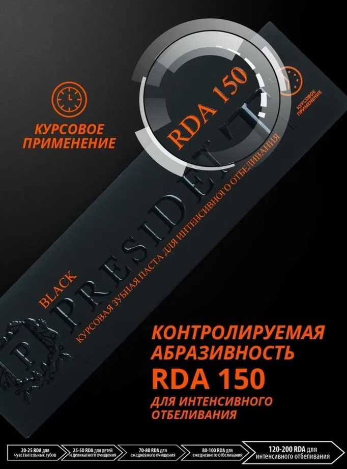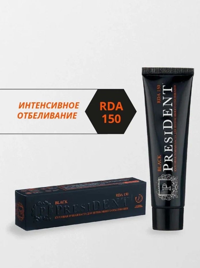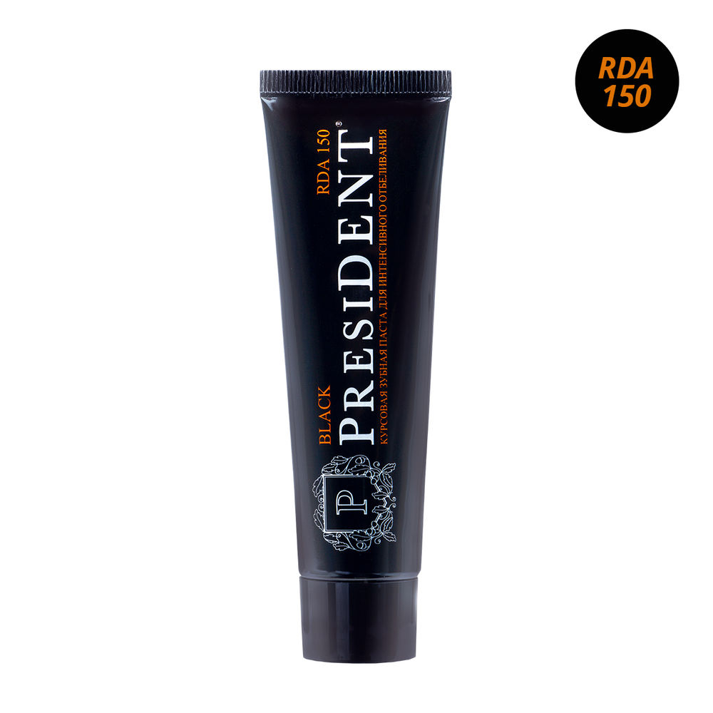 Зубная паста "President Black RDA 150" – это курсовая паста, которая предназначена для интенсивного отбеливания зубов.