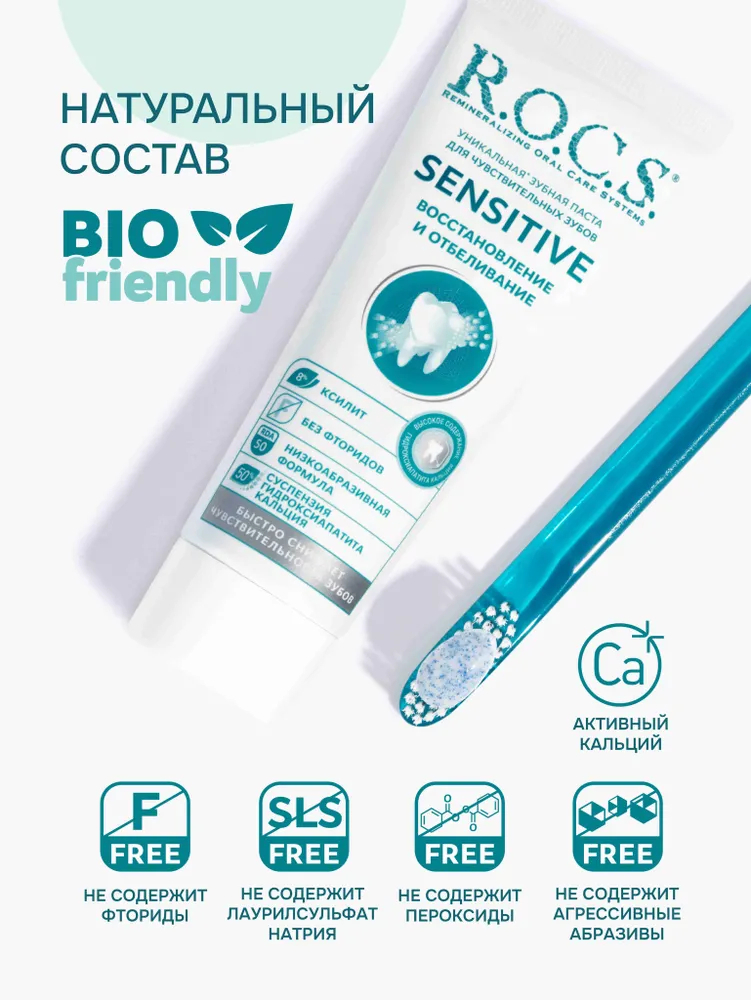 "Зубная паста R.O.C.S.® Sensitive "Repair & Whitening (Восстановление и Отбеливание)" для чувствительных зубов.