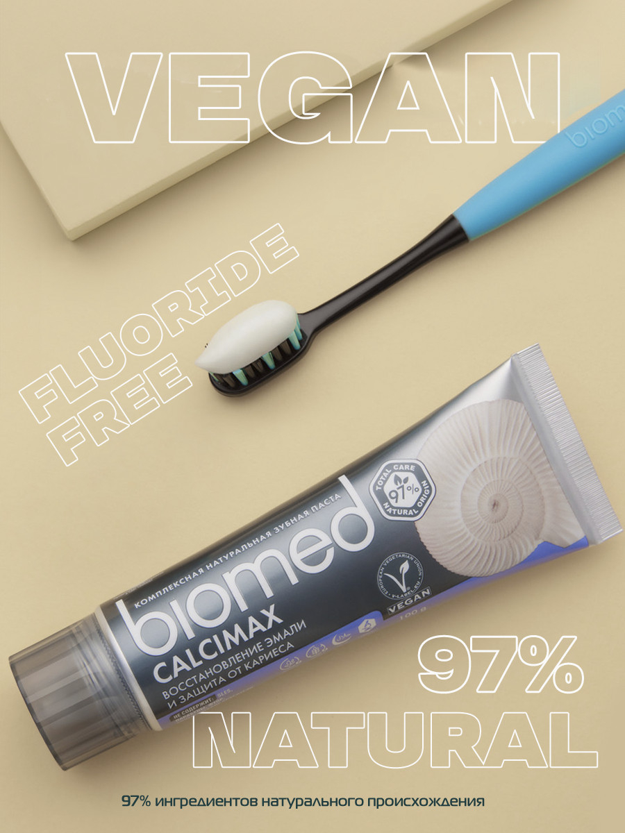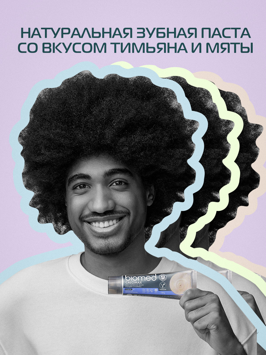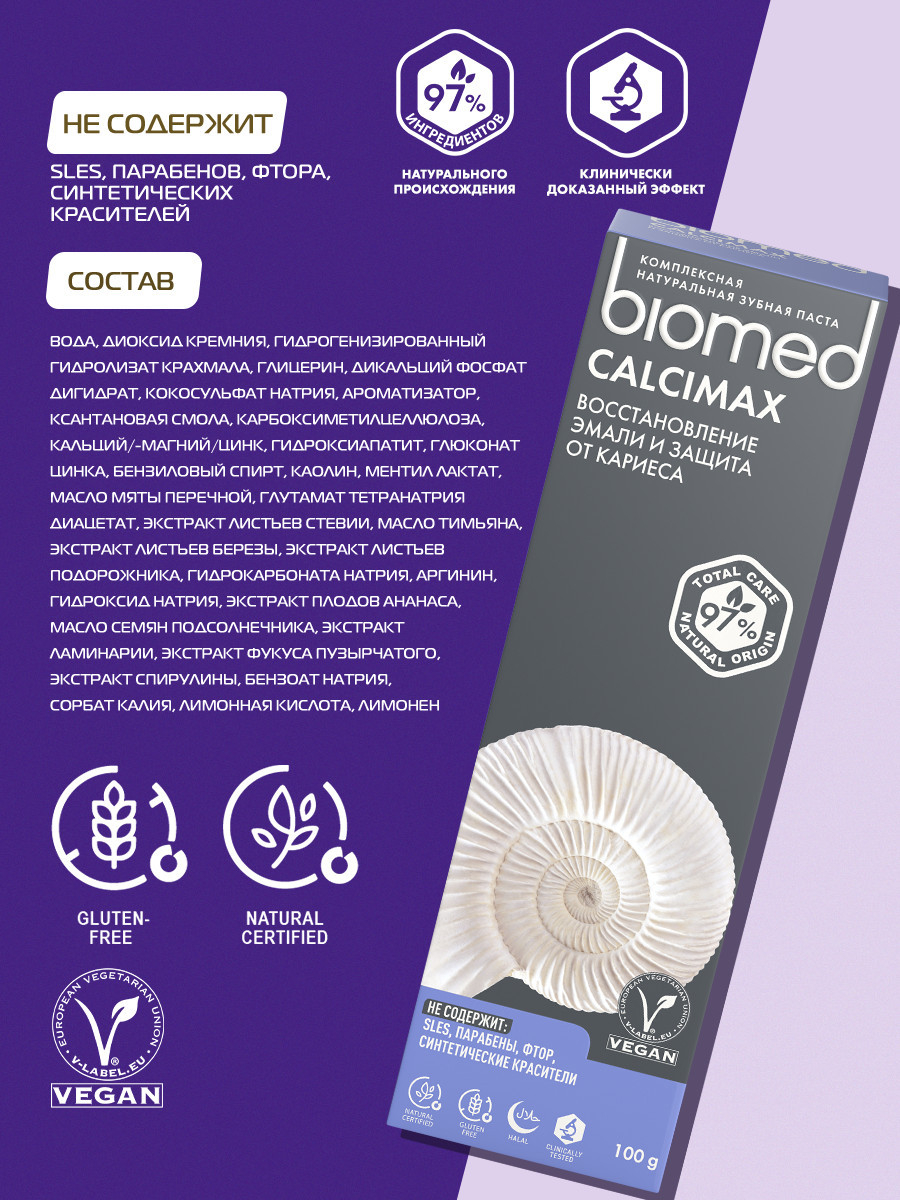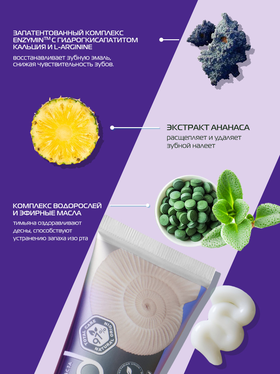Вода, диоксид кремния, гидрогенизированный гидролизат крахмала, глицерин, дикальций фосфат дигидрат, коко-сульфат натрия, ароматизатор, ксантановая смола, карбоксиметилцеллюлоза, кальций/-магний/цинк гидроксиапатит, глюконат цинка, бензиловый спирт, каолин, ментил лактат, масло мяты перечной, глутамат тетранатрия диацетат, экстракт листьев стевии, масло тимьяна, экстракт листьев березы, экстракт листьев подорожника, гидрокарбоната натрия, аргинин, гидроксид натрия, экстракт плодов ананаса, масло семян подсолнечника, экстракт ламинарии, экстракт фукуса пузырчатого, экстракт спирулины, бензоат натрия, сорбат калия, лимонная кислота, лимонен.