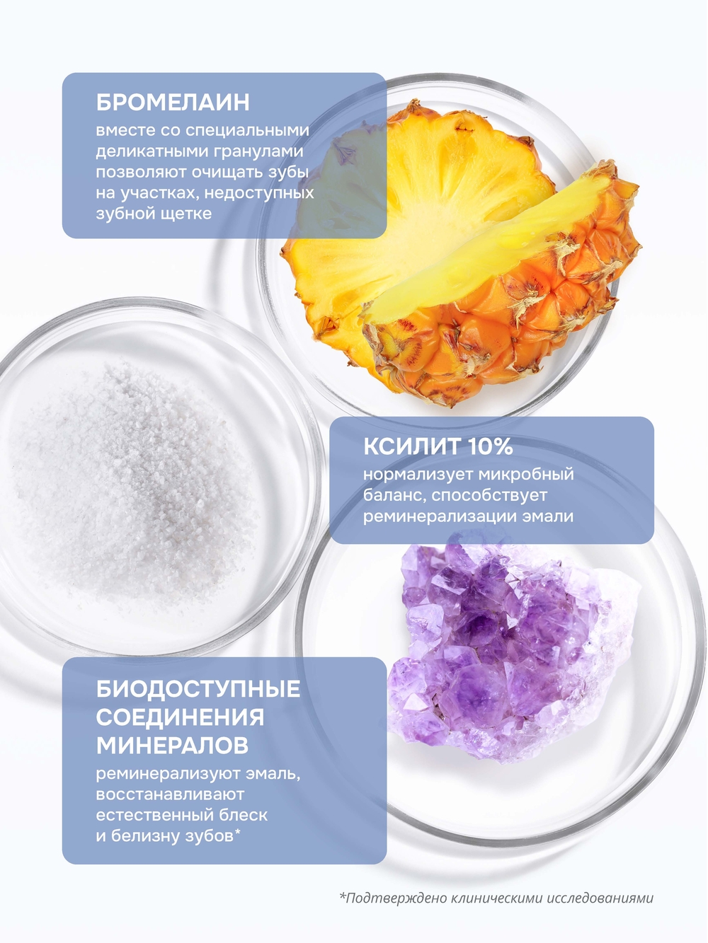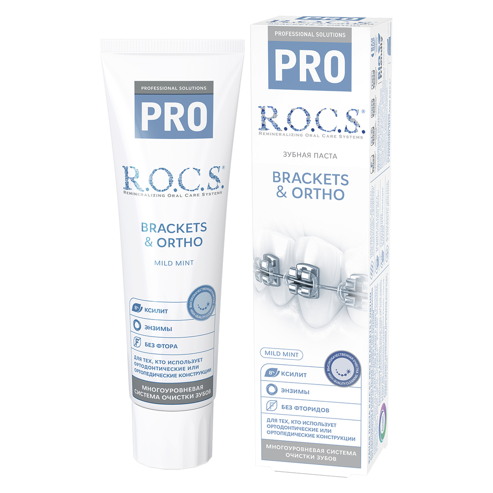 Уникальная** зубная паста R.O.C.S.® PRO Brackets & Ortho благодаря наличию энзимного комплекса позволяет очищать зубы на участках, недоступных зубной щетке, сглаживает факторы воспаления и обеспечивает длительную чистоту зубов.* Растительный фермент растворяет зубной налет, препятствует адгезии бактерий, снижает воспаление и уменьшает кровоточивость десен. Ксилит 8% нормализует микробный баланс, способствует реминерализации эмали. Биодоступные соединения минералов реминерализуют эмаль, восстанавливают естественный блеск и белизну зубов.*