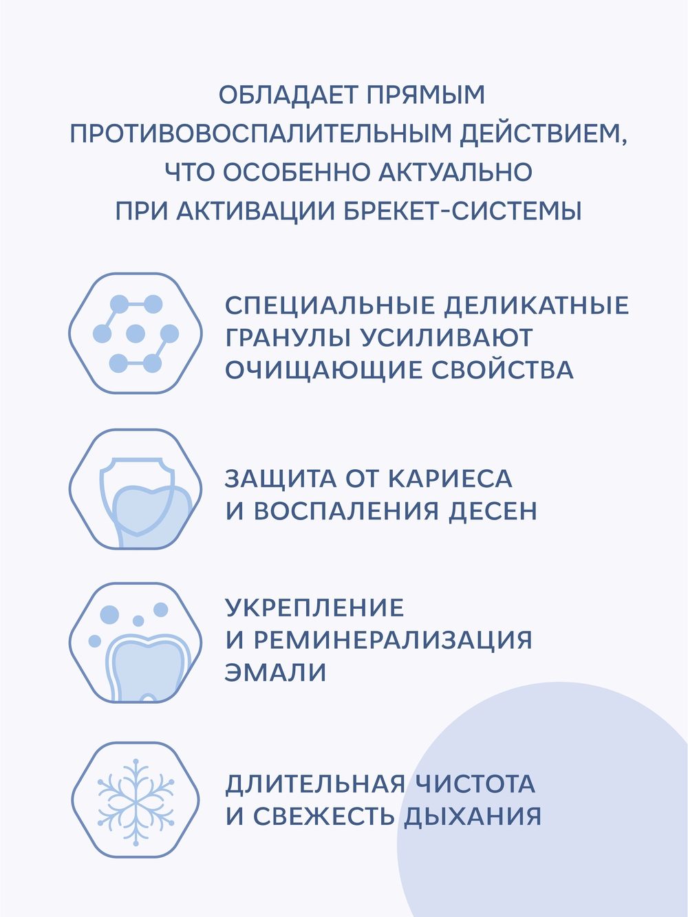 | Назначение | Для ежедневного использования, для очищения брекетов, для очищения зубных протезов, защита от кариеса и налета, при кровоточащих деснах, против воспалений |
