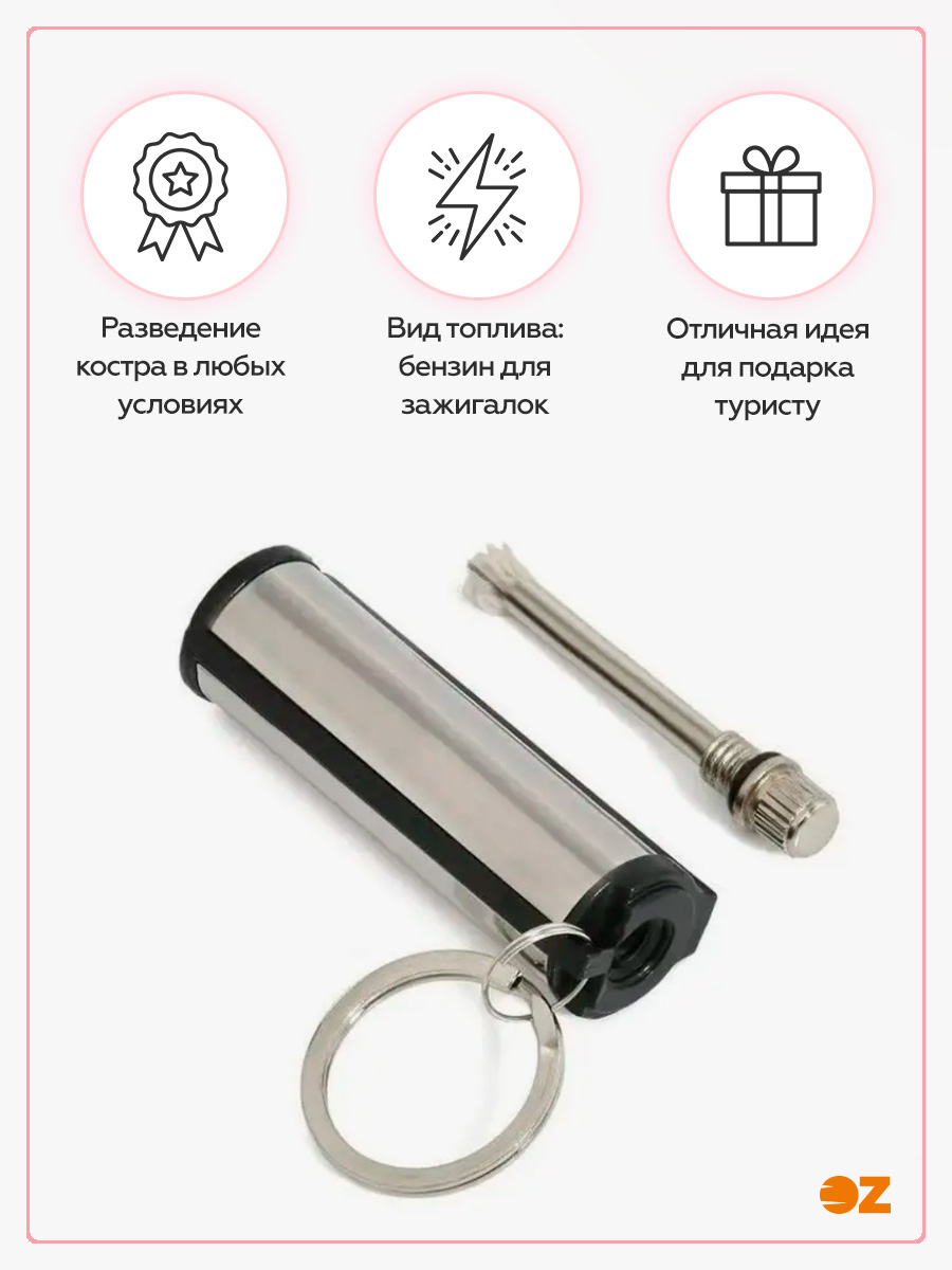 Простое и надежное устройство, которое поможет вам развести костер в любых погодных условиях. Достаточно заправить флакон бензином, выкрутить "спичку" из корпуса и чиркнуть ею по расположенному на боку магниевому цилиндру, чтобы добыть огонь.