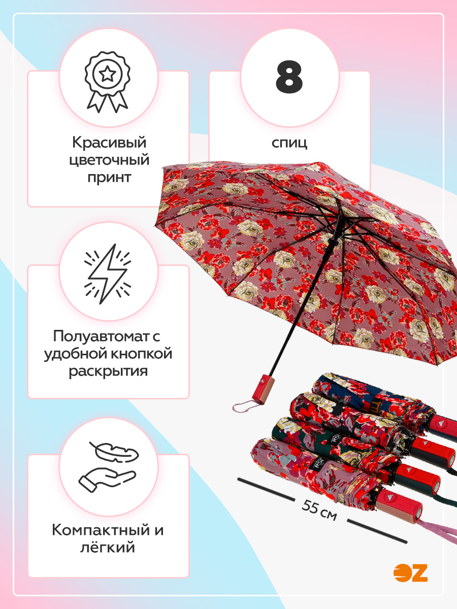 Женский зонт полуавтомат с декоративным принтом будет прекрасно смотреться с плащом или пальто, дополняя романтический образ.