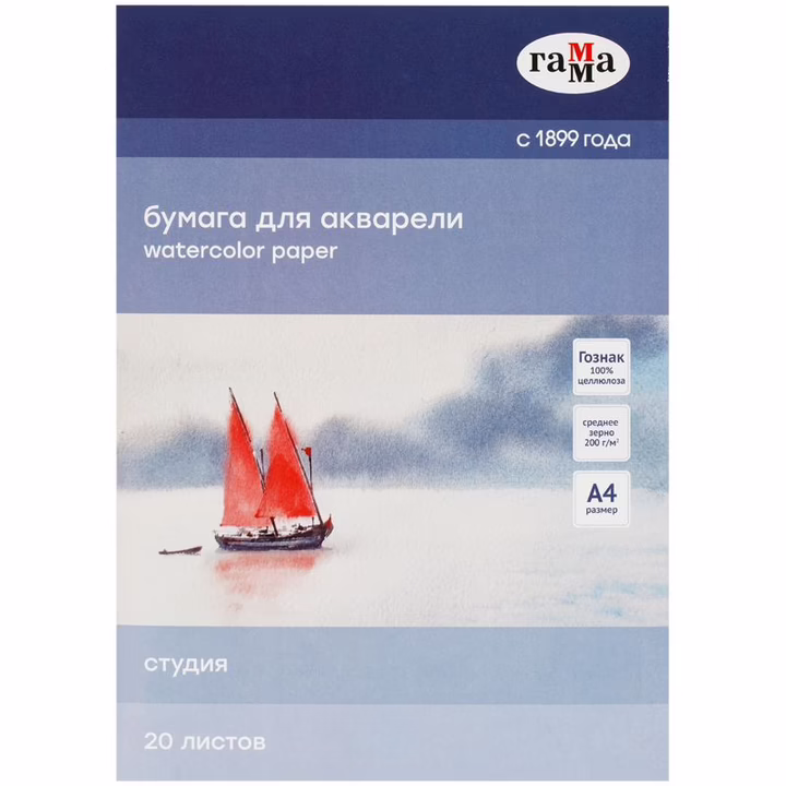 Папка для акварели серии "Студия" плотностью 200 г/м2, средней зернистости, марки А. В папке 20 листов, изготовленных из 100% целлюлозы на заводе "Гознак" без использования оптических отбеливателей.