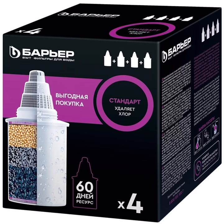 Комплект включает 4 картриджа с ресурсом 350 л.