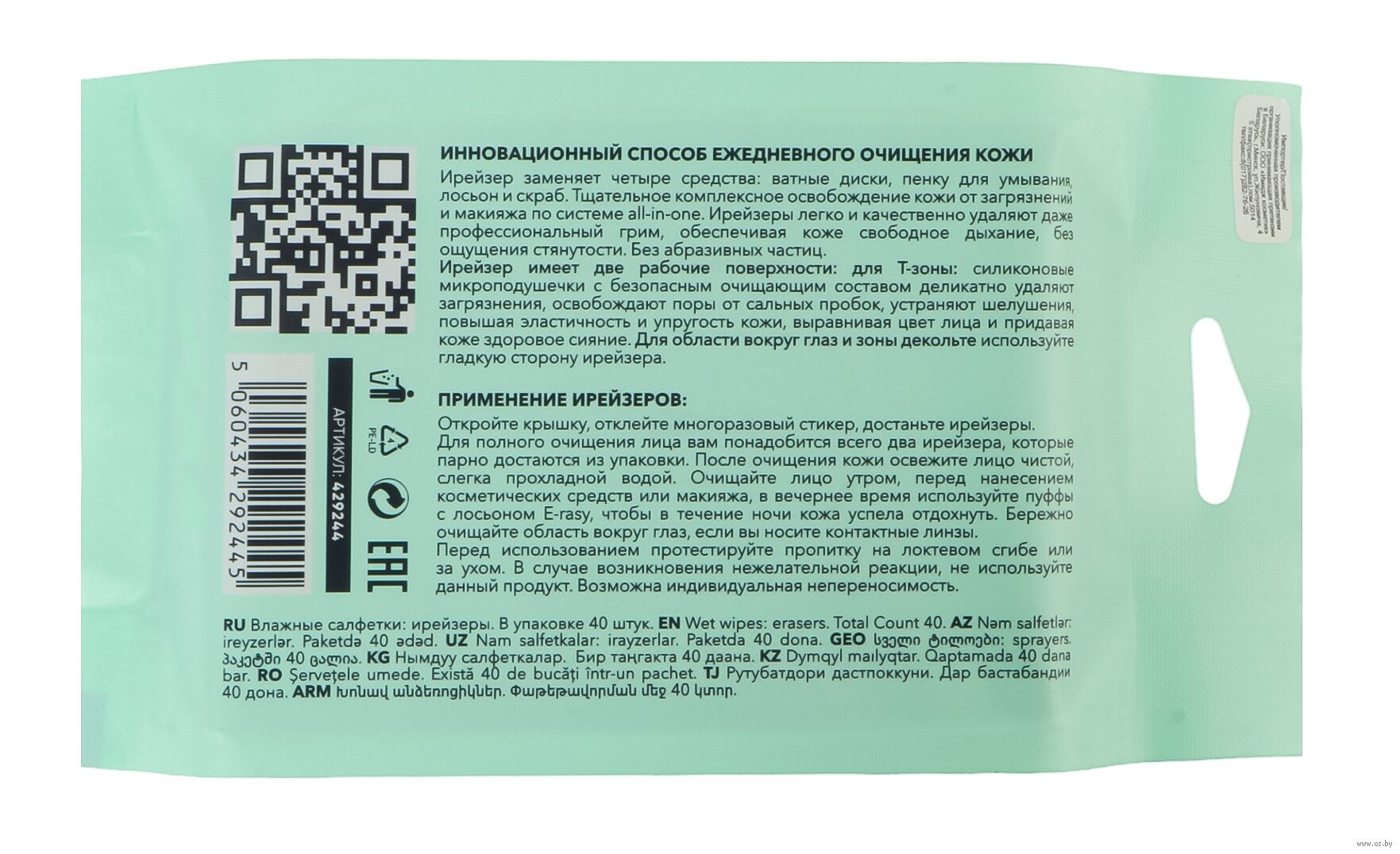 Ирейзер заменяет четыре средства: ватные диски, пенку для умывания, лосон и скраб. Тщательное комплексное освобождение кожи от загрязнений и макияжа по системе all-in-one. Легко и качественно удаляют даже профессиональный грим, обеспечивая коже свободное дыхание, без ощущения стянутости. Без абразивных частиц.