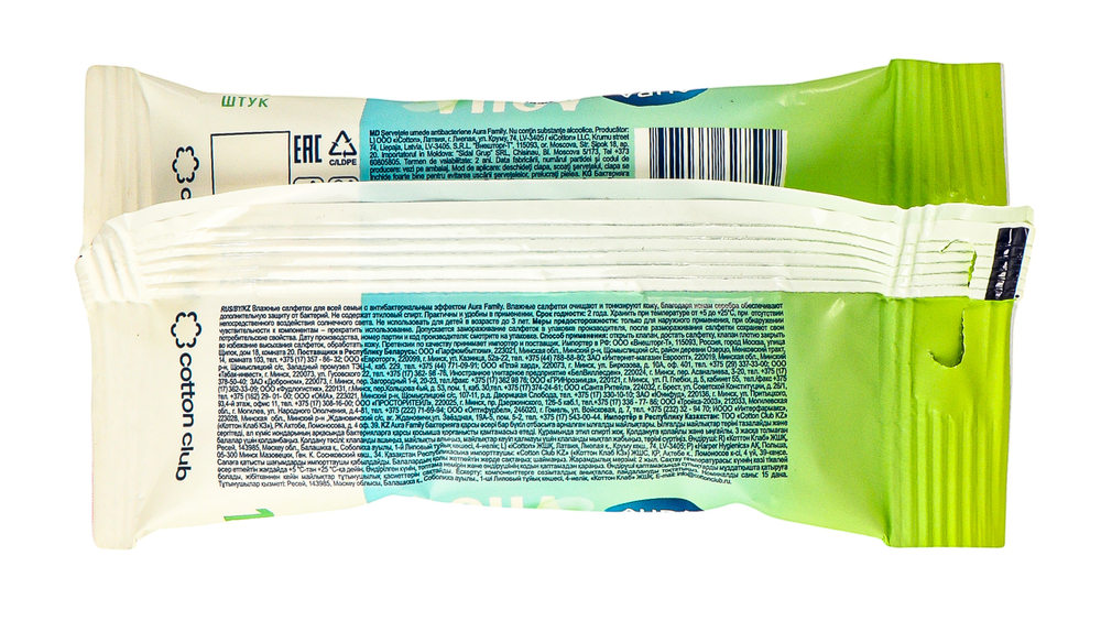Влажные салфетки из нетканого полотна, пропитанные лосьоном (вода, бензоат натрия, пропиленгликоль) с антибактериальным свойством в цефленовом пакете с клапаном.