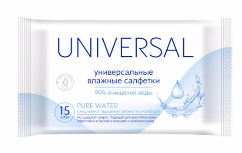 Влажные салфетки универсальные UNIVERSAL PURE WATER предназначены для мягкого очищения без использования воды и мыла. Ухаживающие компоненты с повышенным содержанием 99% очищенной воды. обладают увлажняющим и смягчающим эффектом. Не содержат спирта.
