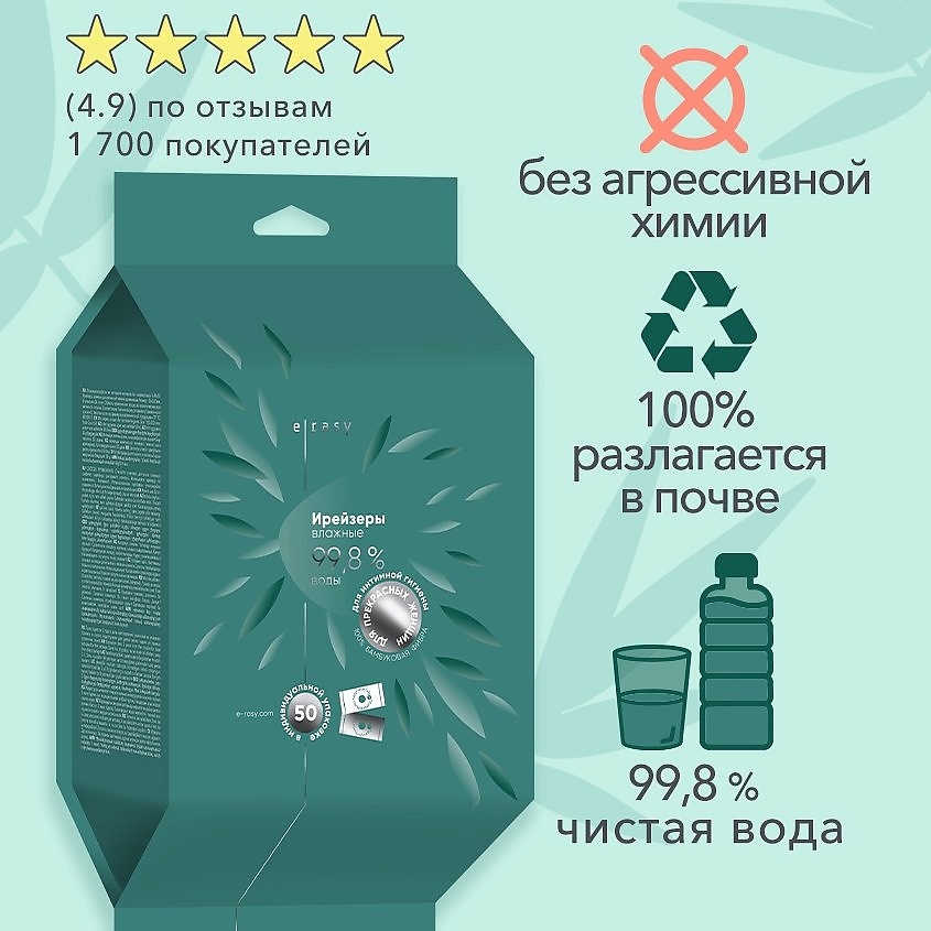 Ежедневные влажные салфетки для интимной гигиены E-RASY свободны от парабенов, сульфатов и искусственных красителей, что делает их безопасными для вашего здоровья и окружающей среды.