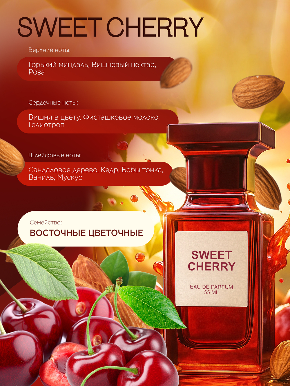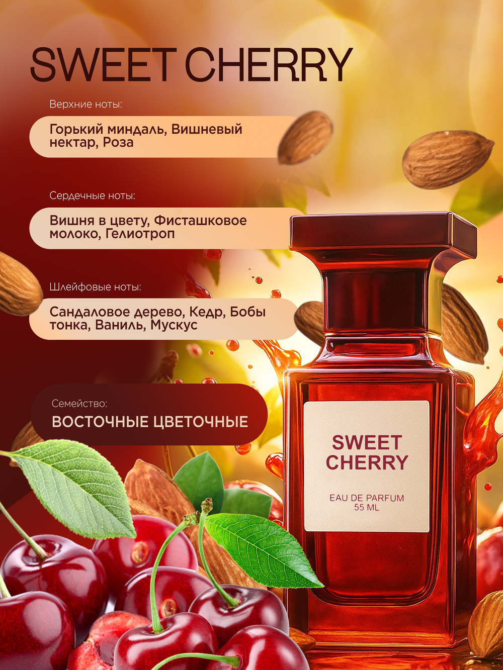 Аромат "Sweet Cherry", дурманящий своей горьковатой сладостью, вскружит голову любому, кто решится испытать на себе его чары.