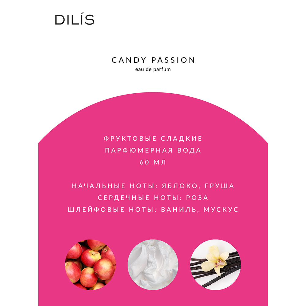 Запах весны, задорной молодости и первых нежных чувств воплощается в волшебном звучании женского аромата Candy Passion. Фруктовый коктейль начинает яркую пирамиду аромата. Постепенно на смену фруктовым ноткам приходит утонченная нежность розы – символа красоты и женственности, изысканности и страсти. Доминируя на уровне сердца, розовый аромат придает еще большее очарование и таинственность. Проходит немного времени, и головокружительный микс ароматов накрывает пленительное послевкусие ванили и мускуса, а восточные завершающие ноты придают особенную сладость шлейфовому звучанию.