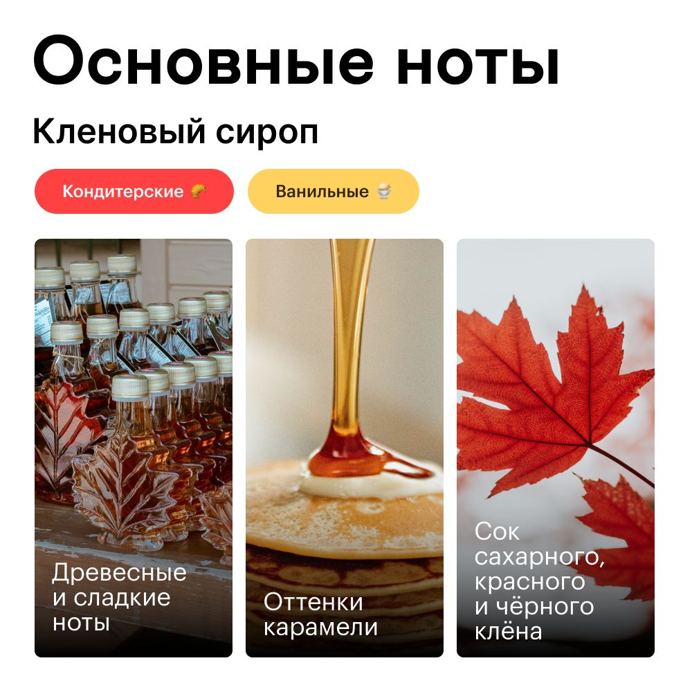 Один из наших любимых осенних ароматов создан в честь сладкого сиропа: из сока сахарного, красного и чёрного клёна. Настоящий кленовый сироп имеет легкий древесный привкус.