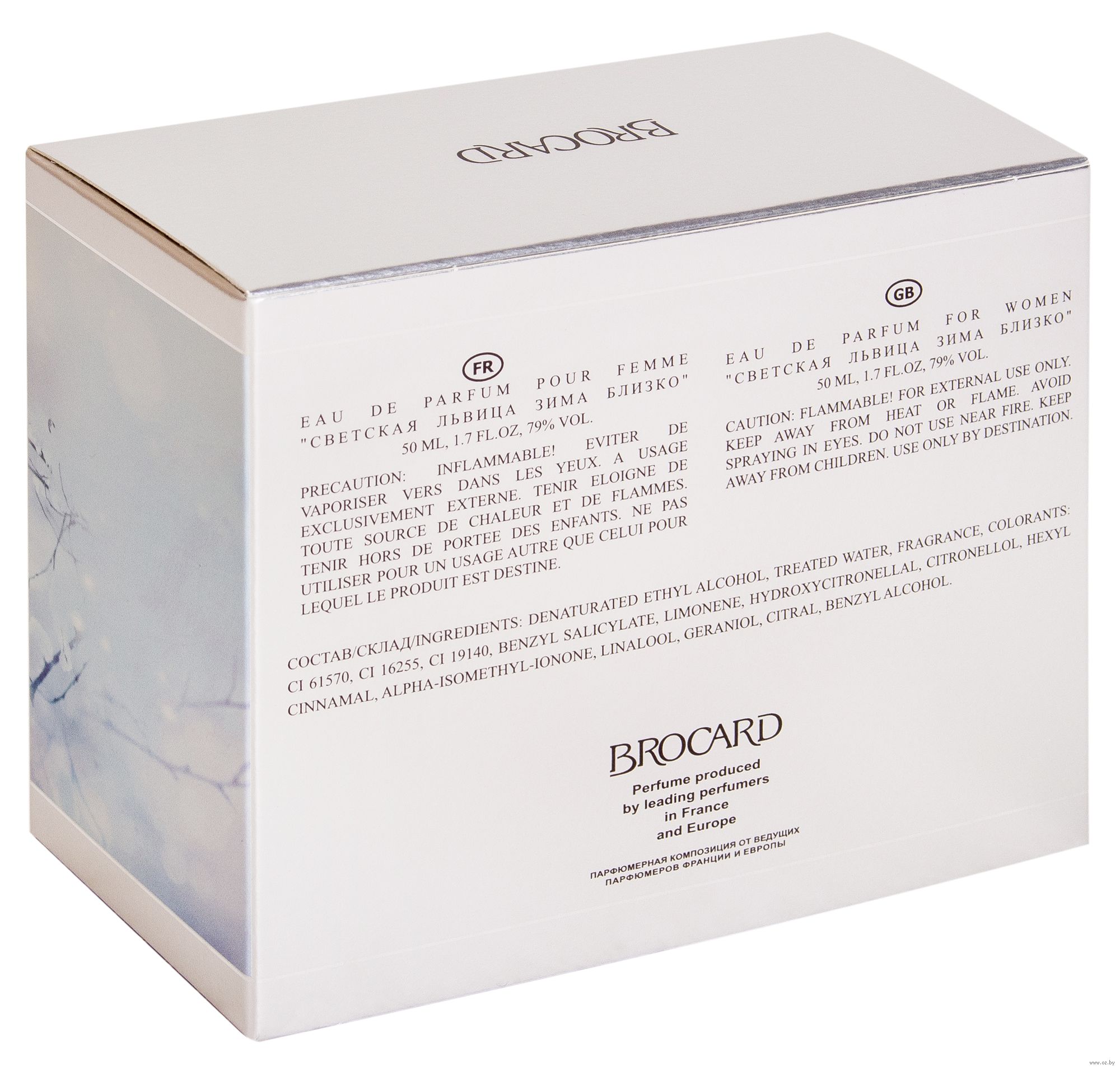 Российский парфюмерный бренд Brocard выпустил к зимним торжествам 2015-2016 года коллекционную новинку, аромат для женщин "Светская Львица Зима Близко". Это – фланкер парфюма 2008 года "Светская Львица", теперь он представлен лимитированной серией и наделен более тонким и изысканным, сверкающим и прохладным звучанием. Он подобен мерцанию снежинок в свете вечерних фонарей. Эфемерный, нежный и волшебный, как зимняя сказка, парфюм обладает цветочным, фруктово-древесным звучанием, в котором объединены деликатность, романтика и благородство. На старте парфюма слышны чистые акватические ноты, запахи звонких цитрусов – лимона, апельсина и грейпфрута. В "сердце" раскрывается нежность цветов – розы, фиалки и жасмина. Сочную, игривую ноту привносит запах душистой груши. В завершении композиции мягко стелются оттенки сандала, мягкого мускуса и чистого хвойного кедра.