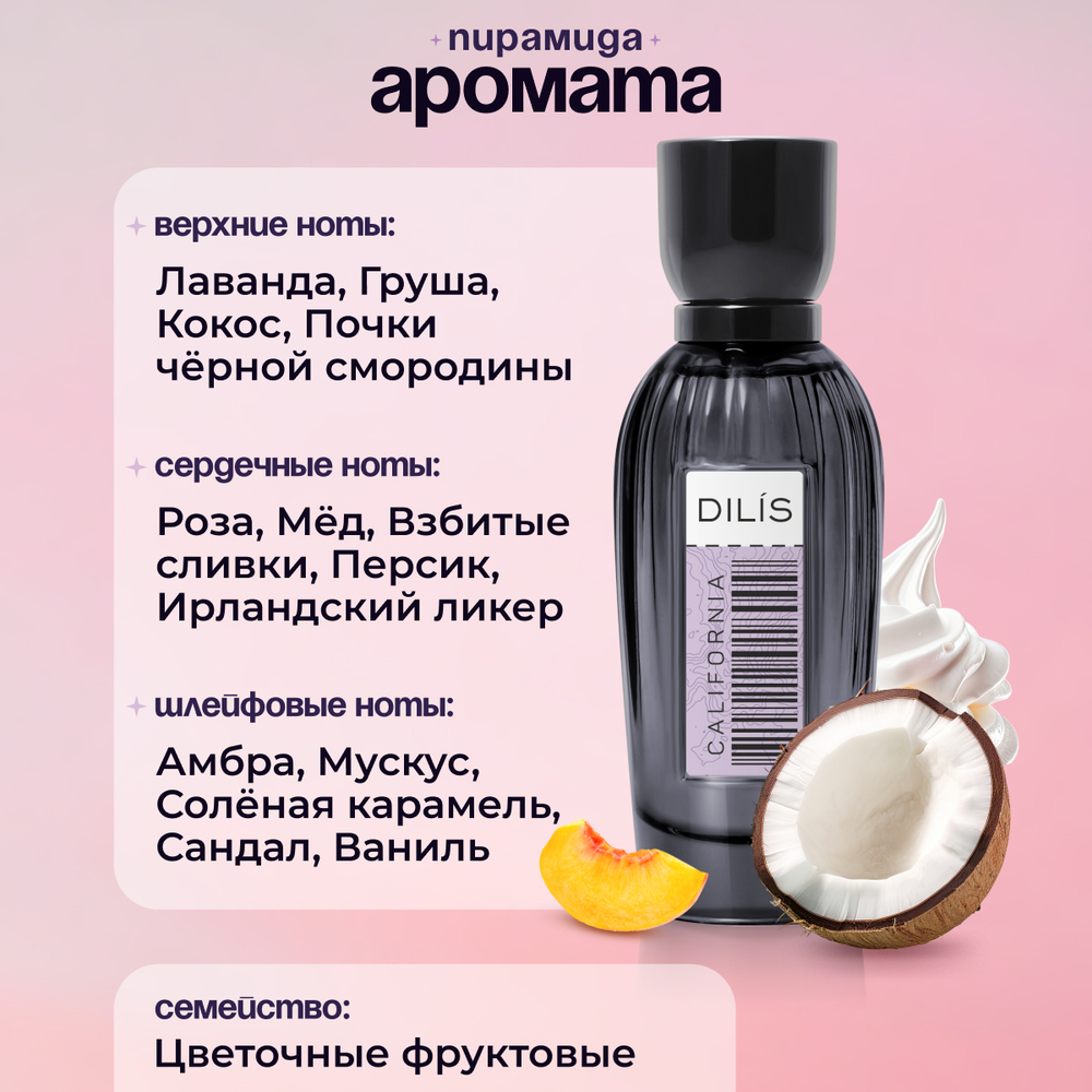 Парфюмерная пирамида притягательного аромата "California" начинает свое звучание томными нотами лаванды, груши, кокоса и почек черной смородины. В сердце композиции – многогранный коктейль из розы, меда, взбитых сливок, персика и ирландского ликера. Мягкий и длинный шлейф аромата раскрывается нотами амбры, мускуса, соленой карамели, сандала и сладкой ванили.