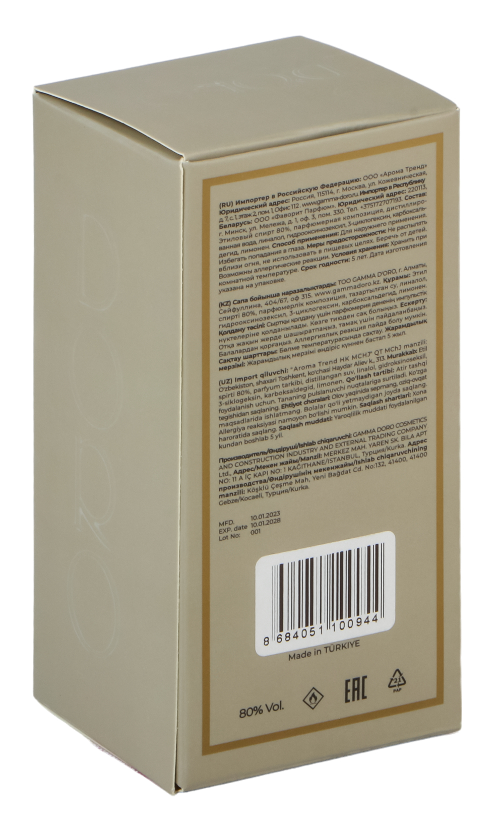 | Изготовитель | Gamma Doro Kozmetik Ve İnsaat Sanayi Ve Dis Ticaret Limited Sirketi, Merkez Mah. Yaren Sk. Bila Apt No: 11 A Ic Kapi No: 1 Kagithane, Istanbul, Turkey |