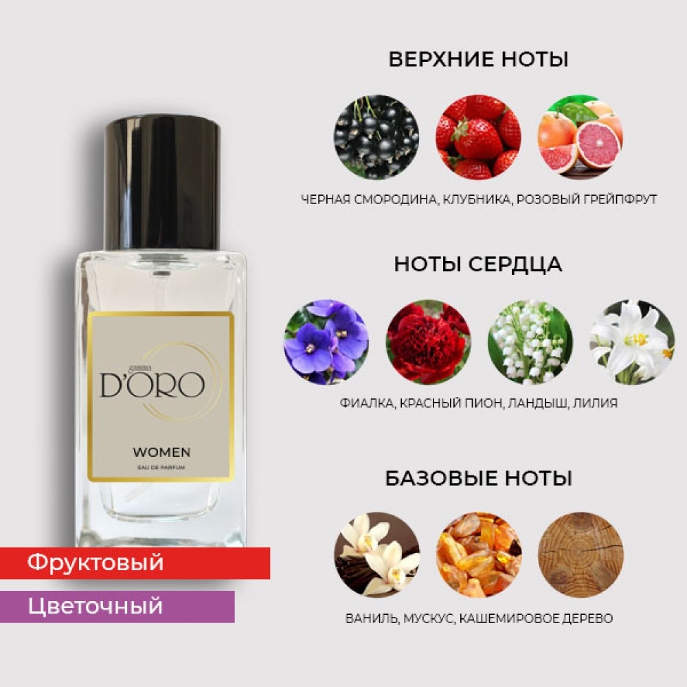 Верхние ноты: Малина, чёрная смородина, клубника, розовый грейпфрут, лист чёрной смородины.