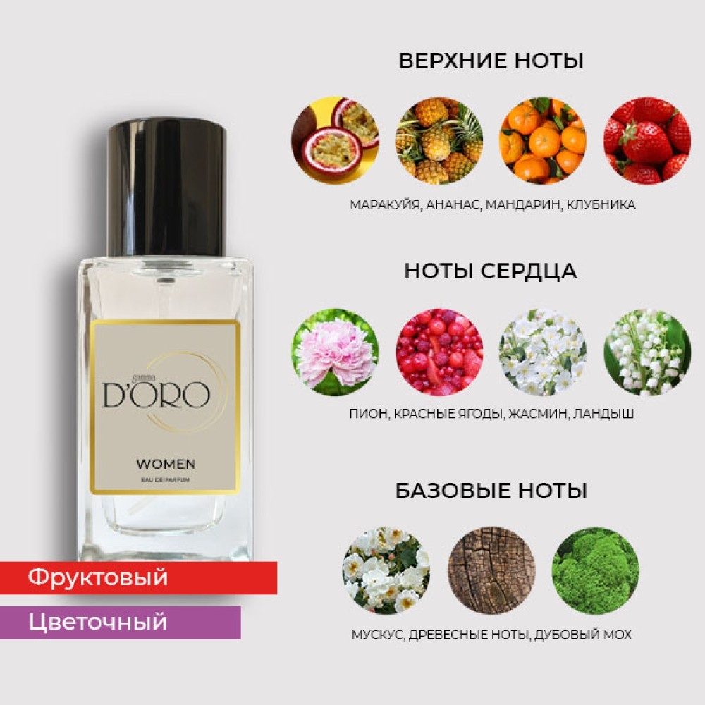 Средние ноты: Пион, ванильная орхидея, красные ягоды, жасмин, ландыш.