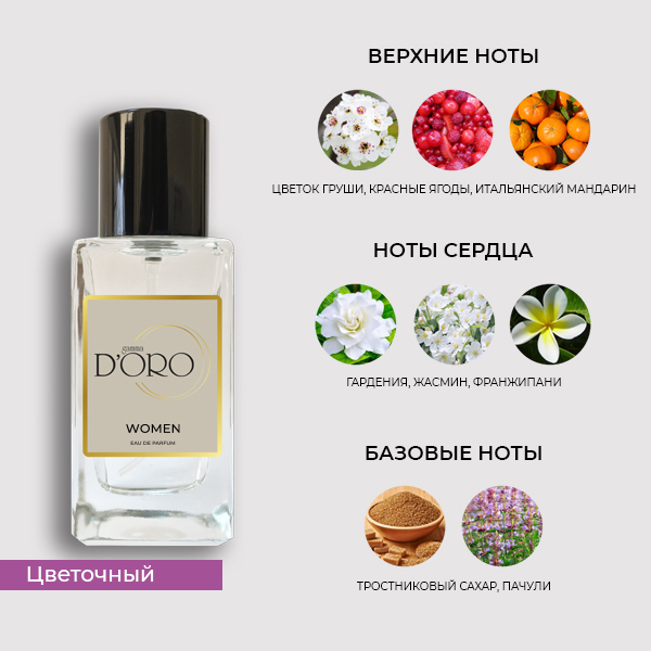 Ноты: цветок груши, красные ягоды, итальянский мандарин, гардения, жасмин, франжипани, тростниковый сахар, пачули.