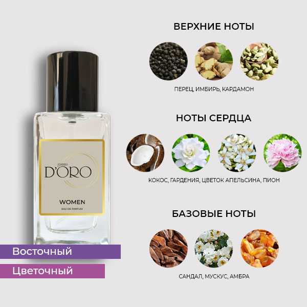 Ноты: перец, имбирь, кардамон, кокос, гардения, цветок апельсина, пион, сандал, мускус, амбра.