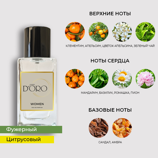 Ноты: клементин, горький апельсин, цветок апельсина, зелёный чай, плющ, мандарин, базилик, ромашка, пион, сандал, амбра.