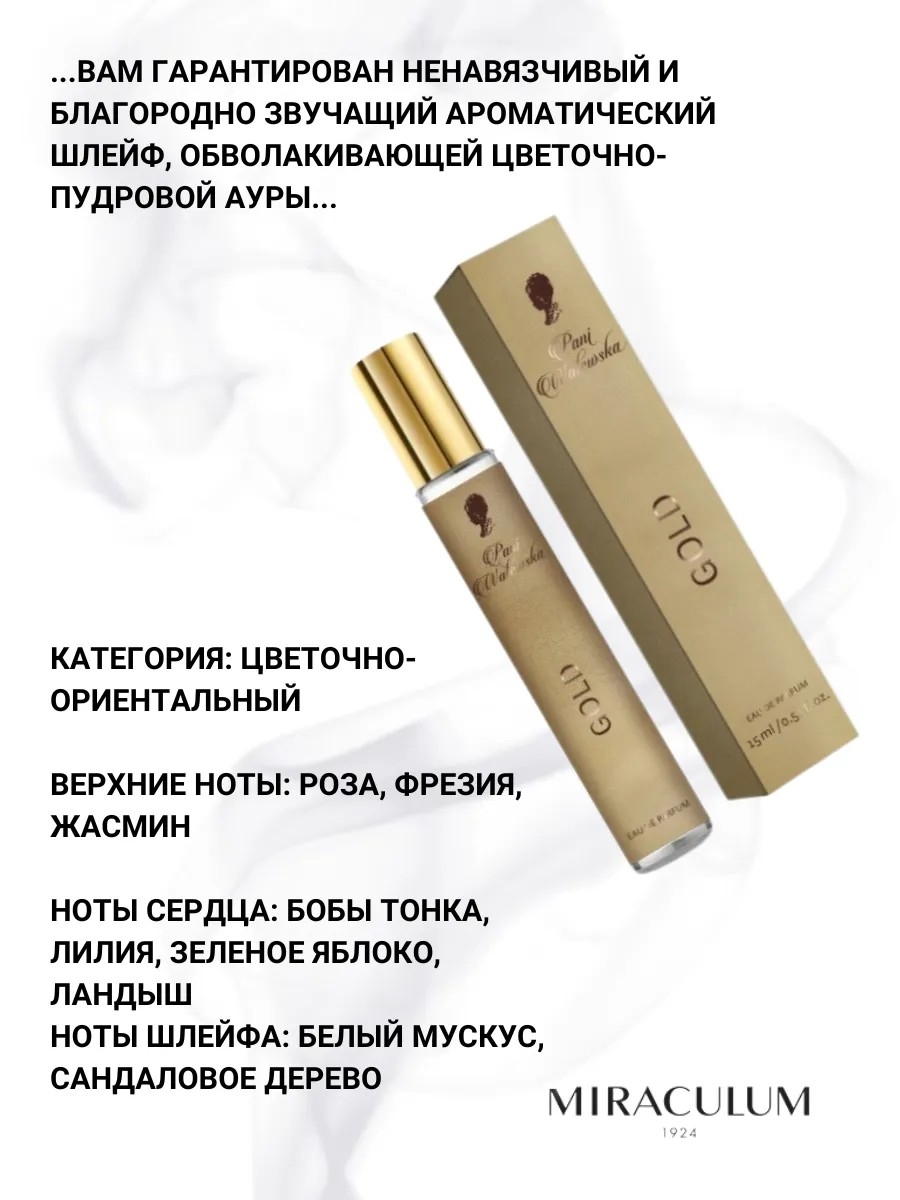 Сочетание восточных и цветочных композиций сделало Miraculum Pani Walewska Gold одним из самых загадочных и восхитительных ароматов современности. Он олицетворяет опыт молодости и ранней жизни, знакомя вас с образом девушки, обладающей красотой, временем, силой, способностями и женской хитростью, чтобы сделать жизнь изящной и неповторимой.