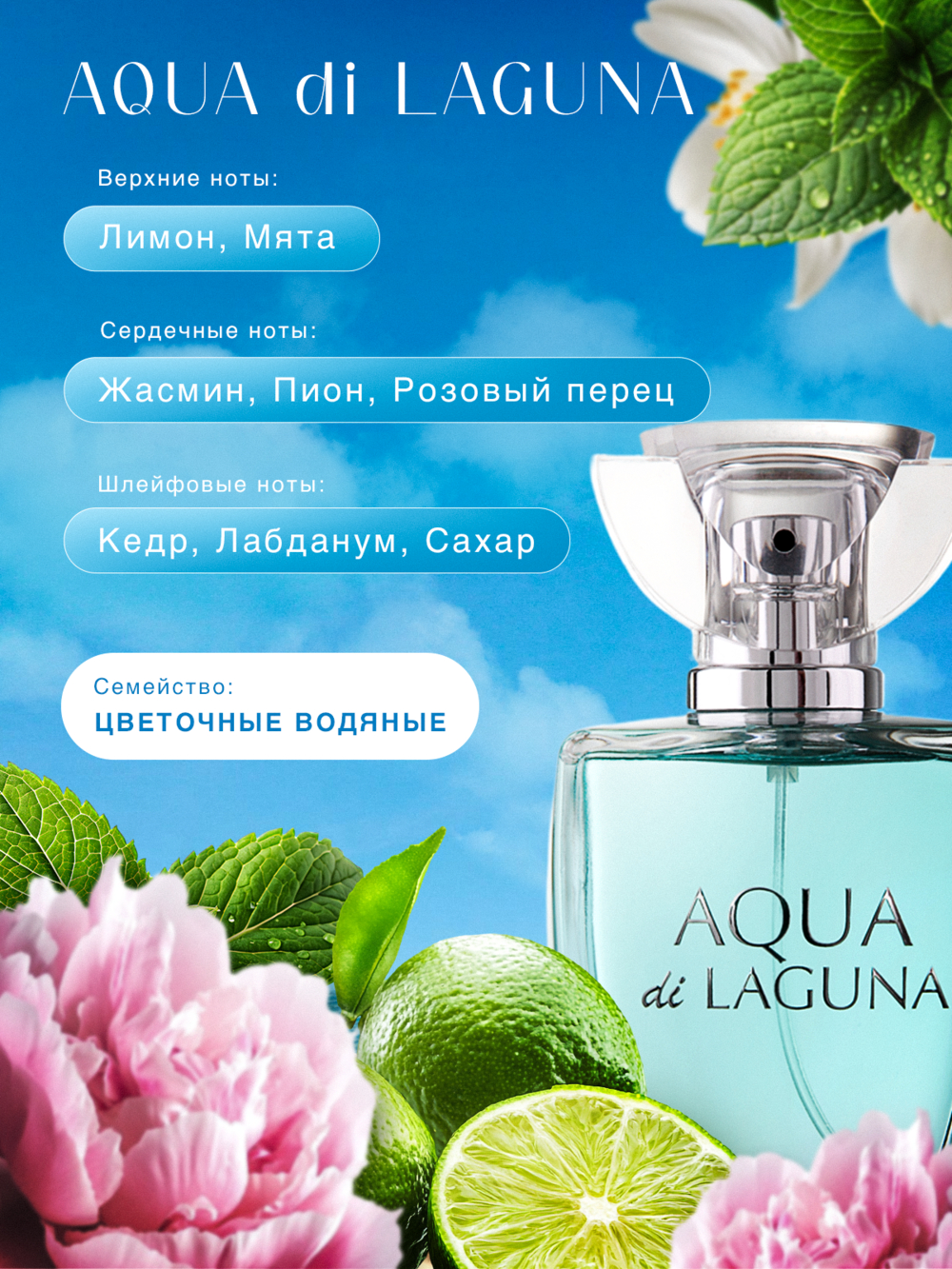 Штормовое предупреждение! Мятная волна окутывает и переносит в открытый океан острых ощущений. И вот вы уже не городская жительница, а лесная нимфа, тропическая сирена. Ваше место там, в уединённой лагуне, где яркое солнце, солёный океан невероятной силы и тёплый песок, щекочущий пальцы. "Aqua di Laguna" – аромат перевоплощения, влажный, тропический, с яркими цветами, причудливо раскрывающимися на коже. Романтичный и одновременно искрящийся, этот запах идеален для знойного дня или летнего вечера. Непринуждённый и яркий, он органично сочетает в себе природные элементы и шум города, создавая комфортное пространство. Вы почувствуете на себе яркое прикосновение свежести и захотите полностью раствориться в мире "Aqua di Laguna".