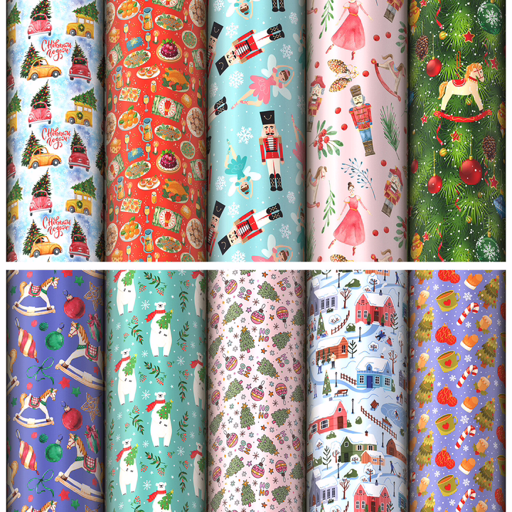 Изготовлена из мелованной бумаги и представлена в 10 универсальных новогодних дизайнах. Бумага плотностью 105 г/м2 упакована в рулоны длиной 100 см и шириной 70 см (± 5%).