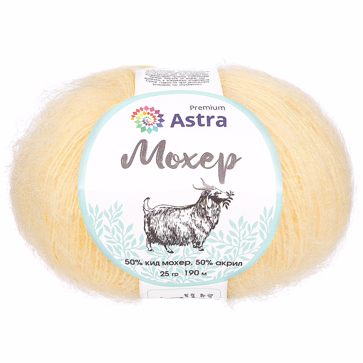 "Мохер" (Mohair) – полушерстяная пряжа от Astra Premium с выраженным ворсом. В составе пряжи – шерсть кид мохер родом из Южной Африки. Волокно кид мохер получают при стрижке полугодовалых козлят ангорской породы. Такая шерсть особенно тонкая, мягкая и отлично согревает.